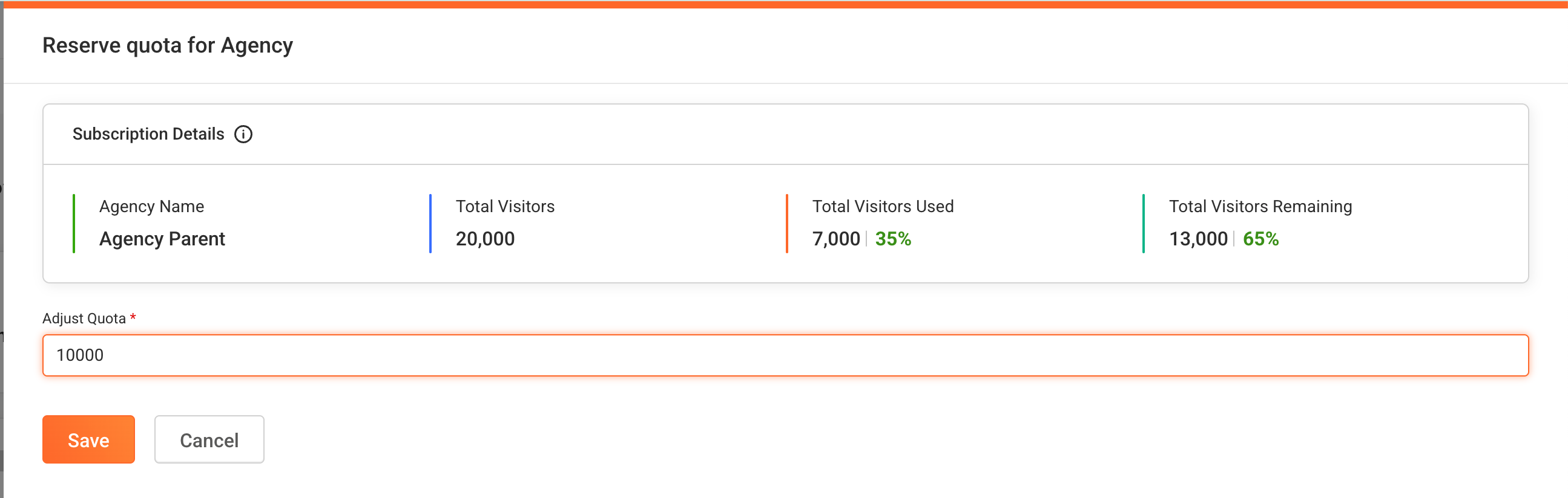 In Reserve for Agency screen, you'll see your subscription details including total visitors used and remaining. Go to the 'Adjust Quota' field to adjust visitor licenses reserved for agency.