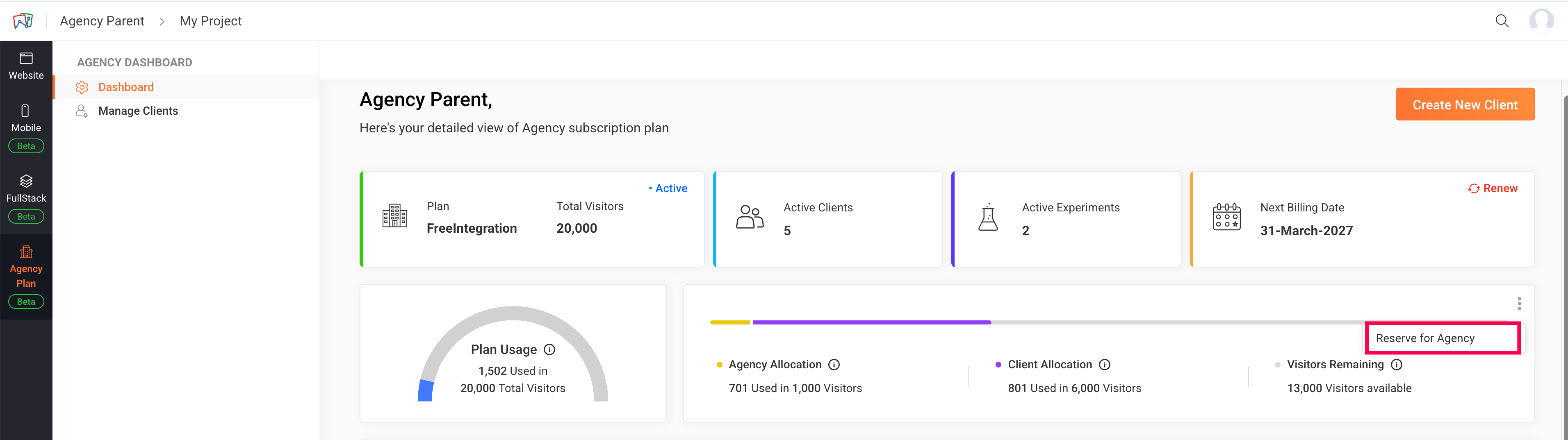 If your agency also runs CRO campaigns for your own website, this is where you can set aside part of your visitor license pool specifically for that. The rest of your licenses can then be allocated to your client accounts.