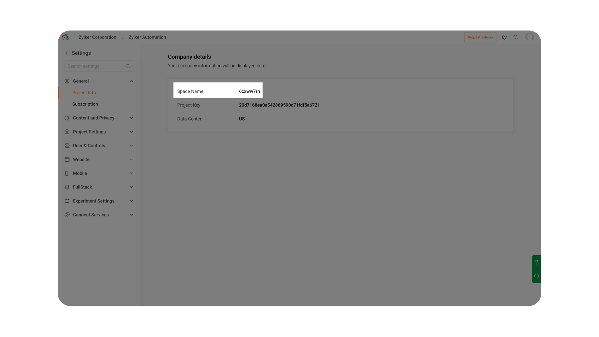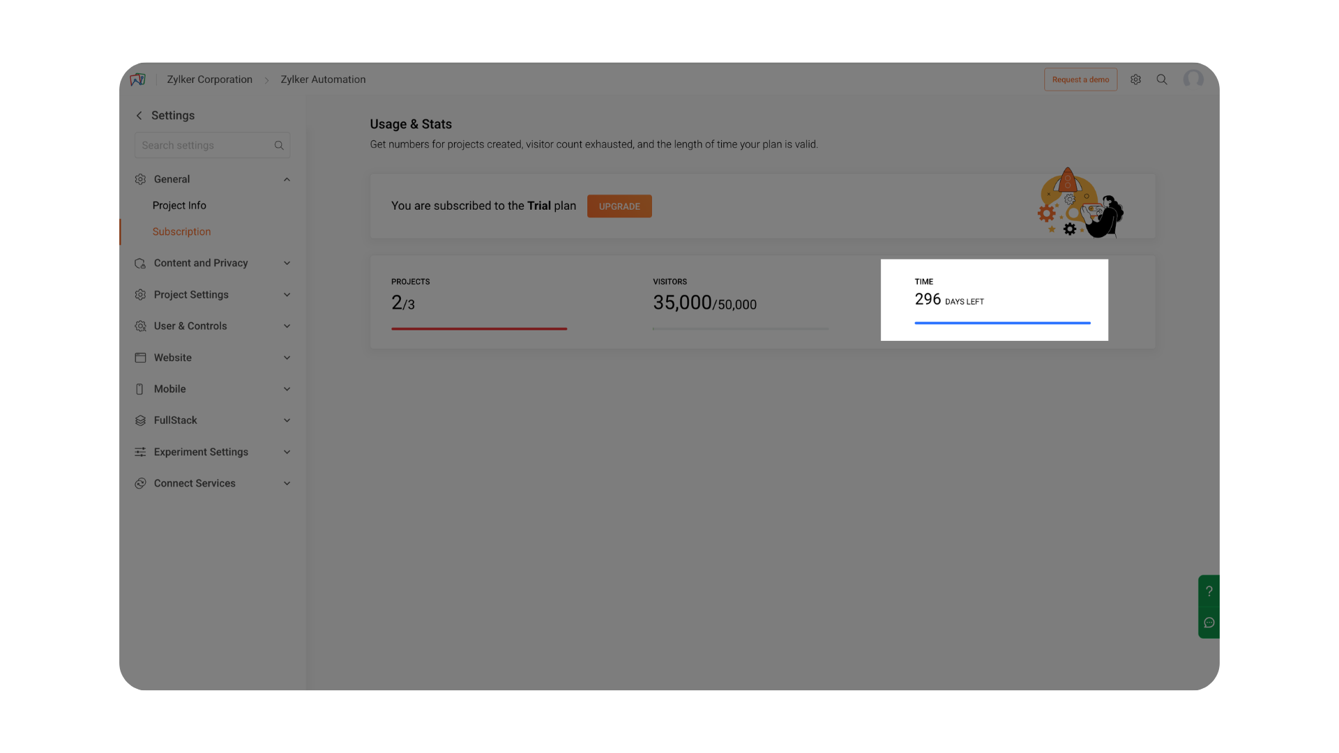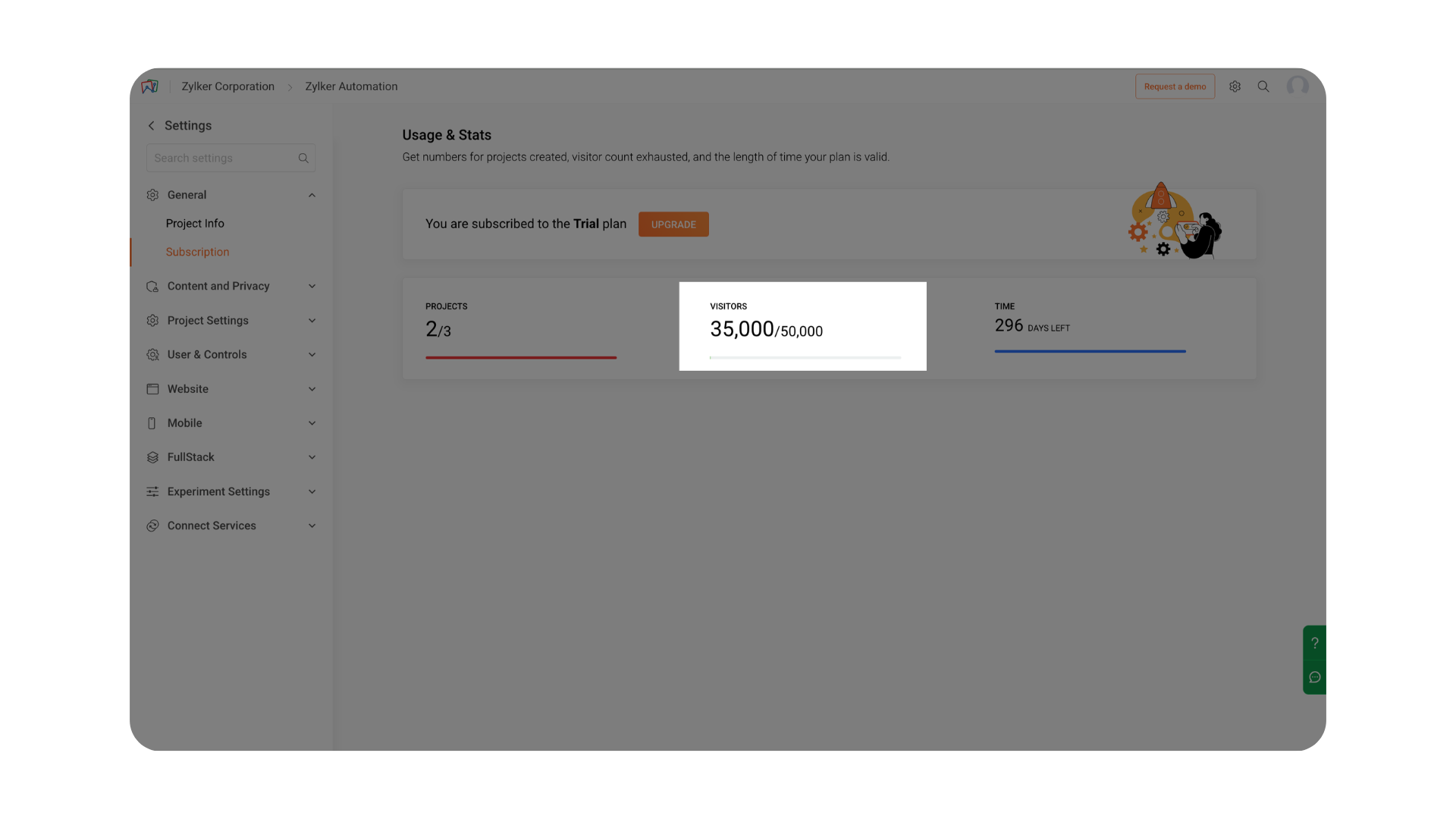 The General section in Settings provides an overview of your project’s essential information and subscription details in Zoho PageSense. It helps you quickly identify the configuration of your project and monitor how your current subscription plan is being utilized.