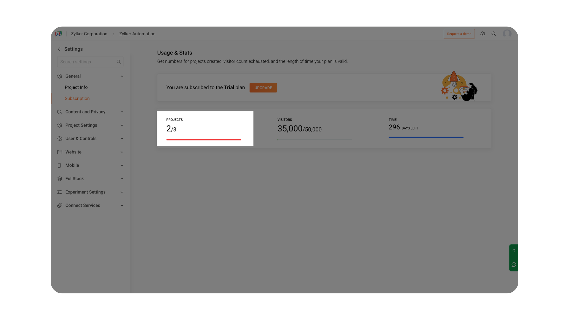 The Projects metric displays the number of projects currently being used compared to the maximum number of projects allowed in your subscription plan.