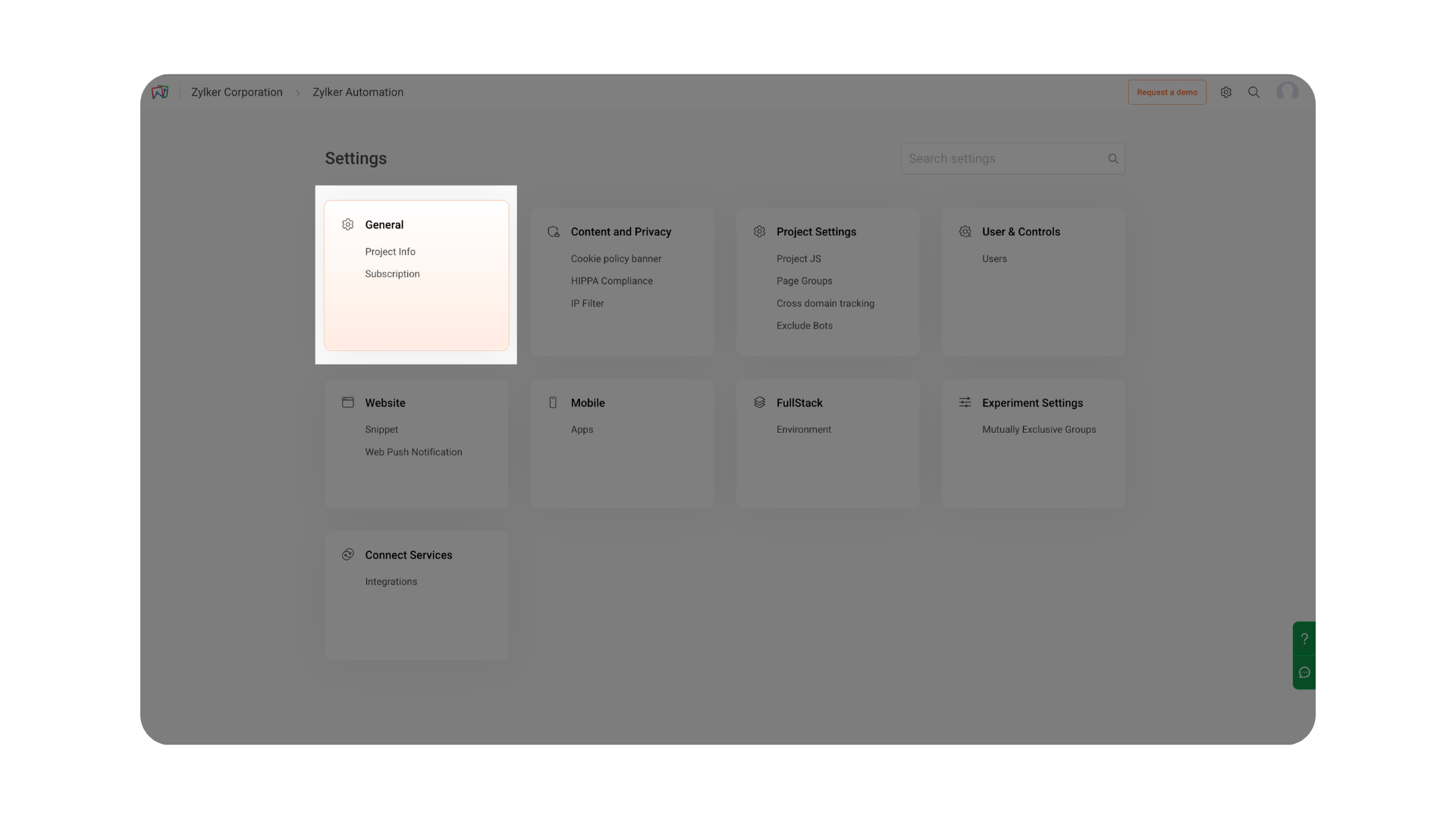 Note: The Settings icon is located in the top-right corner of your PageSense interface. From this icon, you can access Project Settings, which includes the General settings page.The General settings page contains two main sections: