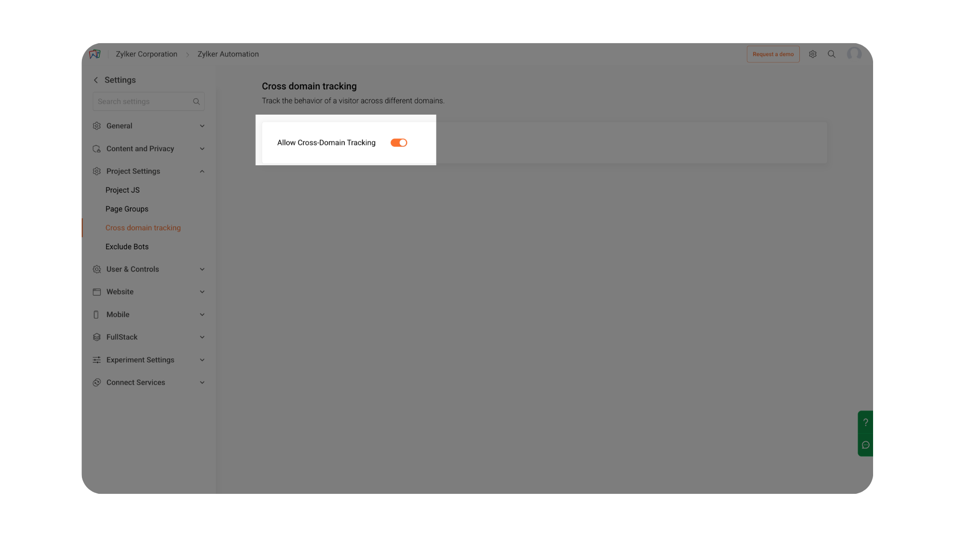 The Cross Domain Tracking feature allows you to track visitor activity across multiple domains that belong to the same organization.