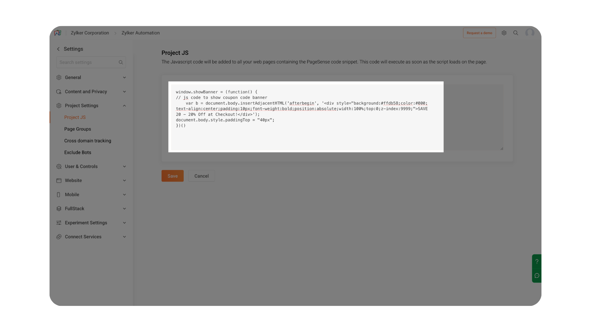 Once the required JavaScript code is added, click Save to apply the script. PageSense will then execute this code automatically on all pages where the PageSense tracking snippet is present.