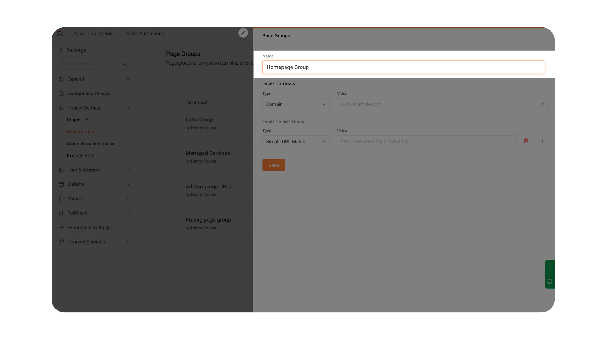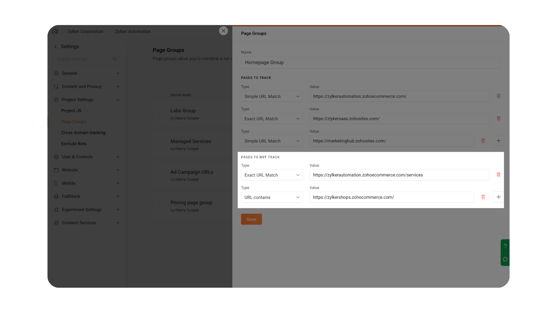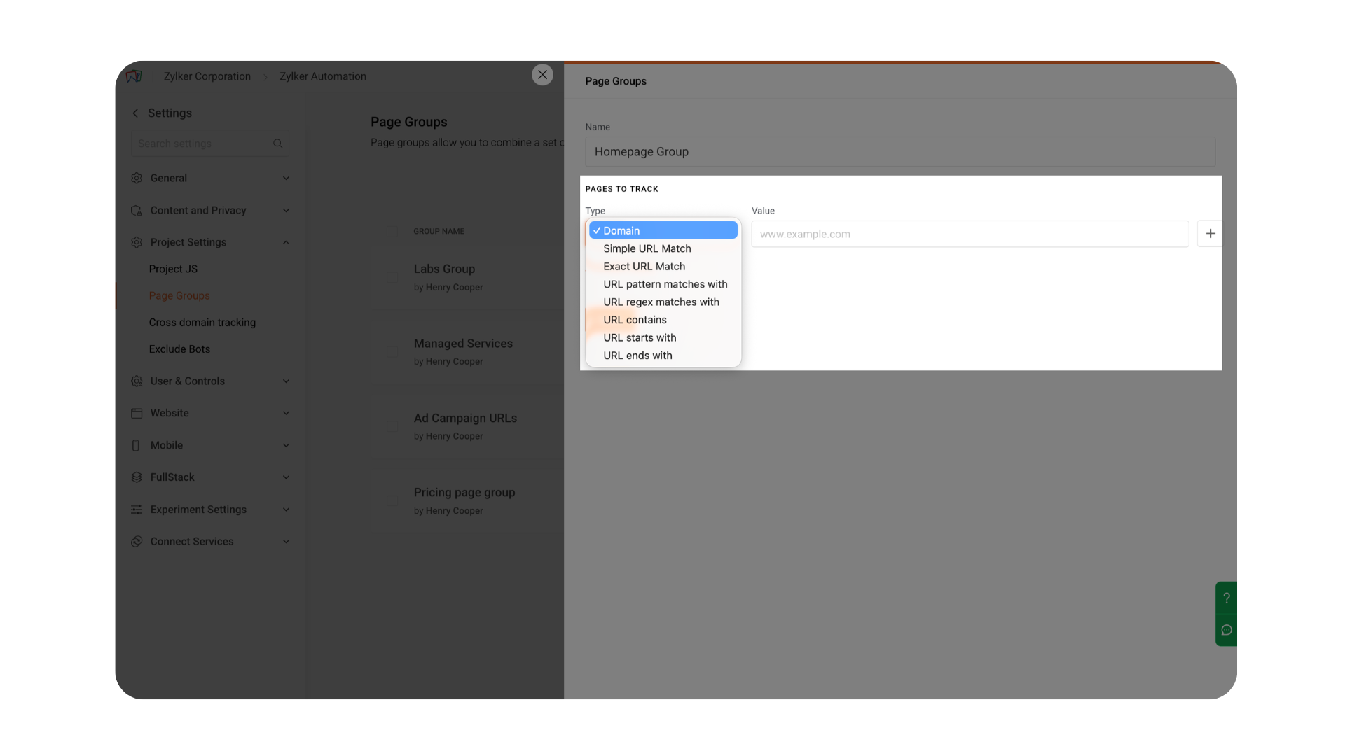 Specify the pages that should be included in the page group. PageSense provides eight URL match types to help you precisely define which pages should be tracked.
