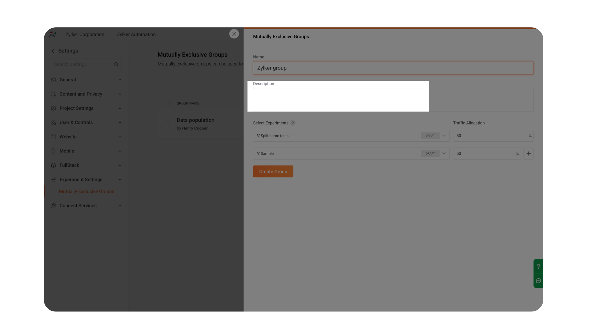 The Description field allows you to add additional information about the purpose of the mutually exclusive group. This may include details about the experiments included, the pages being tested, or the optimization goal.