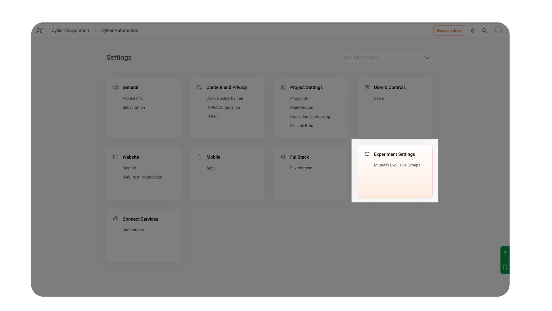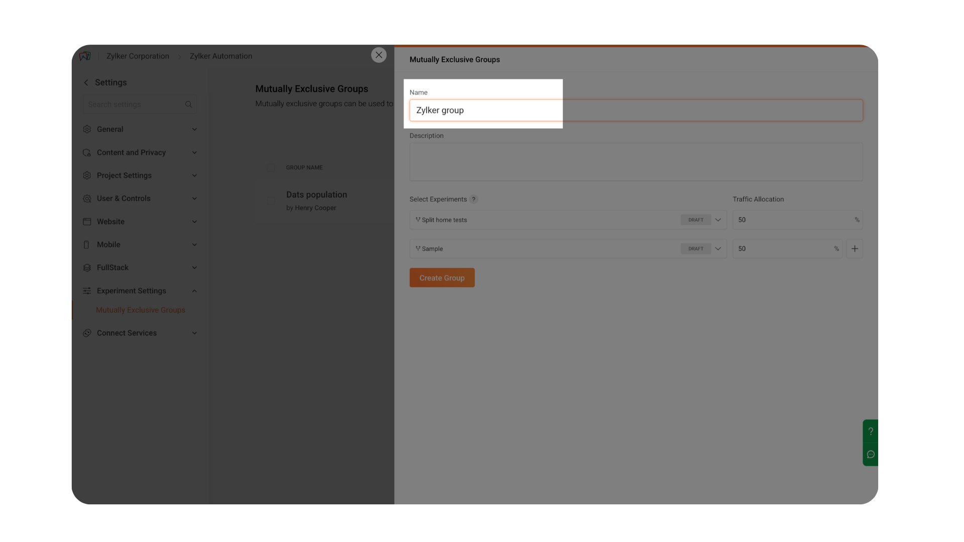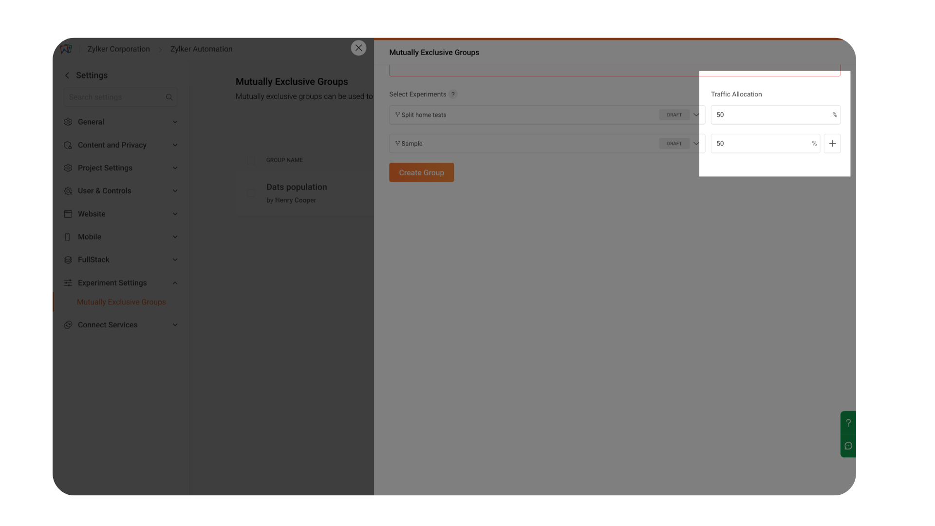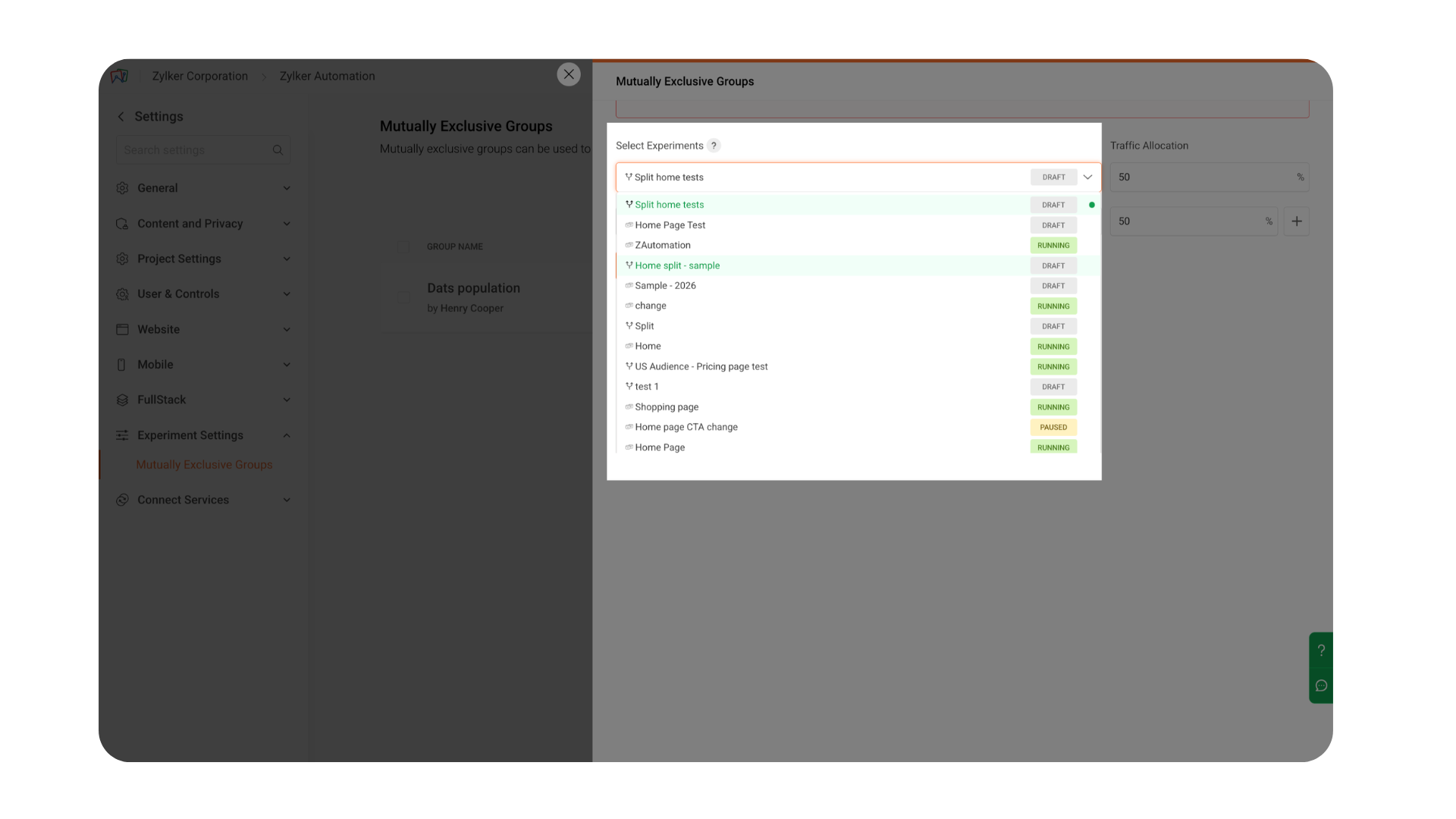 The Mutually Exclusive Groups setting in Zoho PageSense allows you to organize experiments so that a visitor participates in only one experiment within a group at a time. This prevents multiple experiments from targeting the same visitor simultaneously, which helps maintain accurate test results and avoids conflicting user experiences on your website.