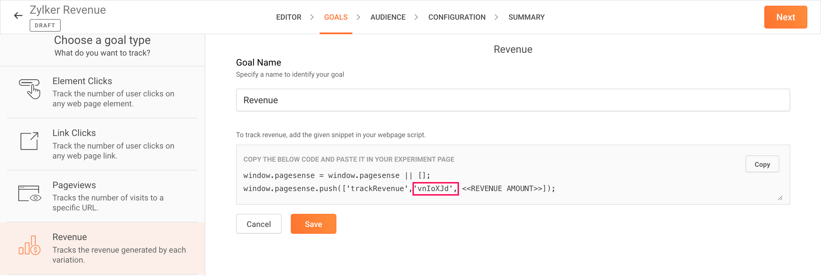 - window.pagesense.push(['trackRevenue', '<REVENUE-GOAL-ID>', (checkoutTotalPrice * 100)]);