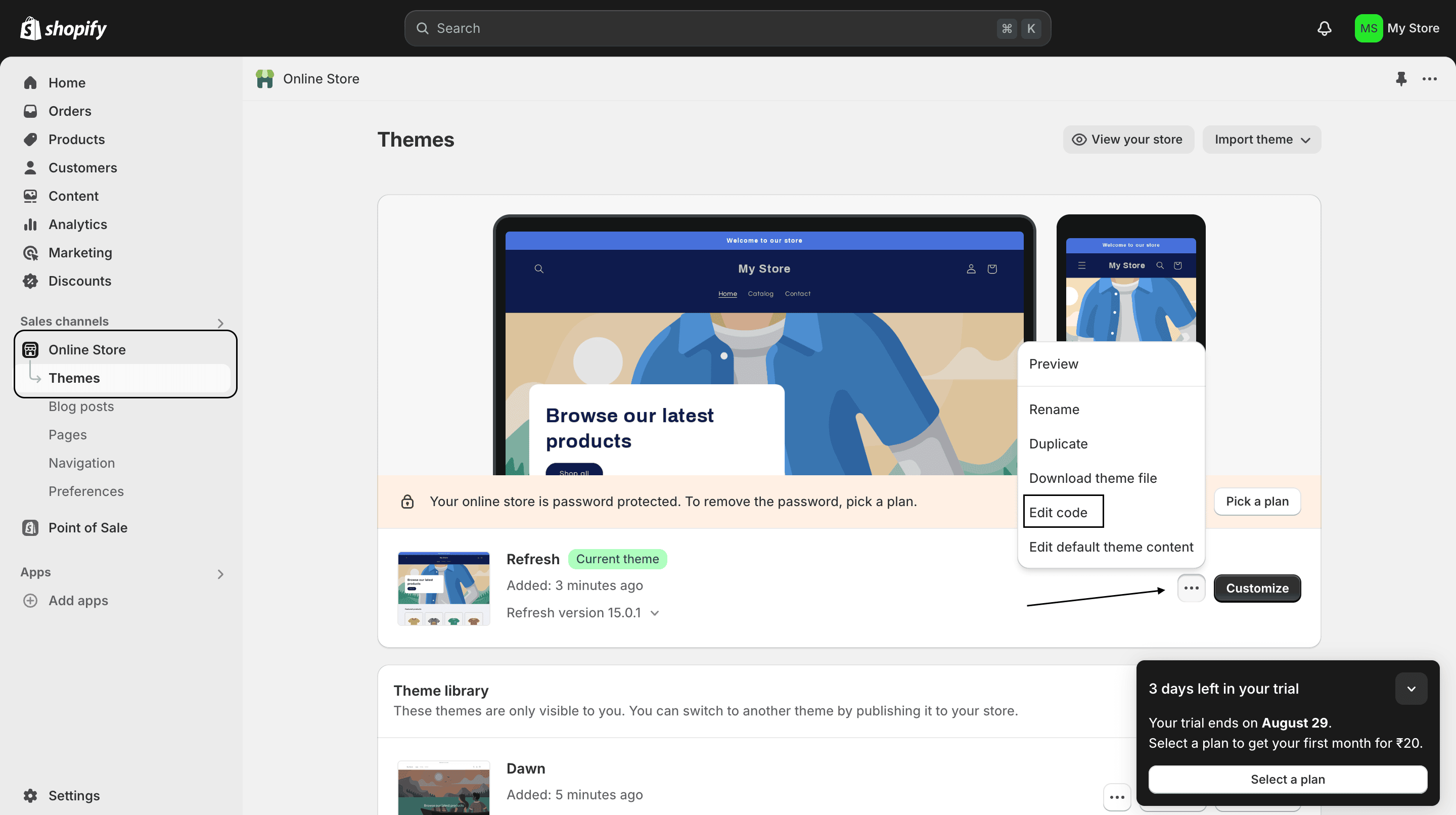 3. Click on the more option near to the customize button on the page and choose Edit code.