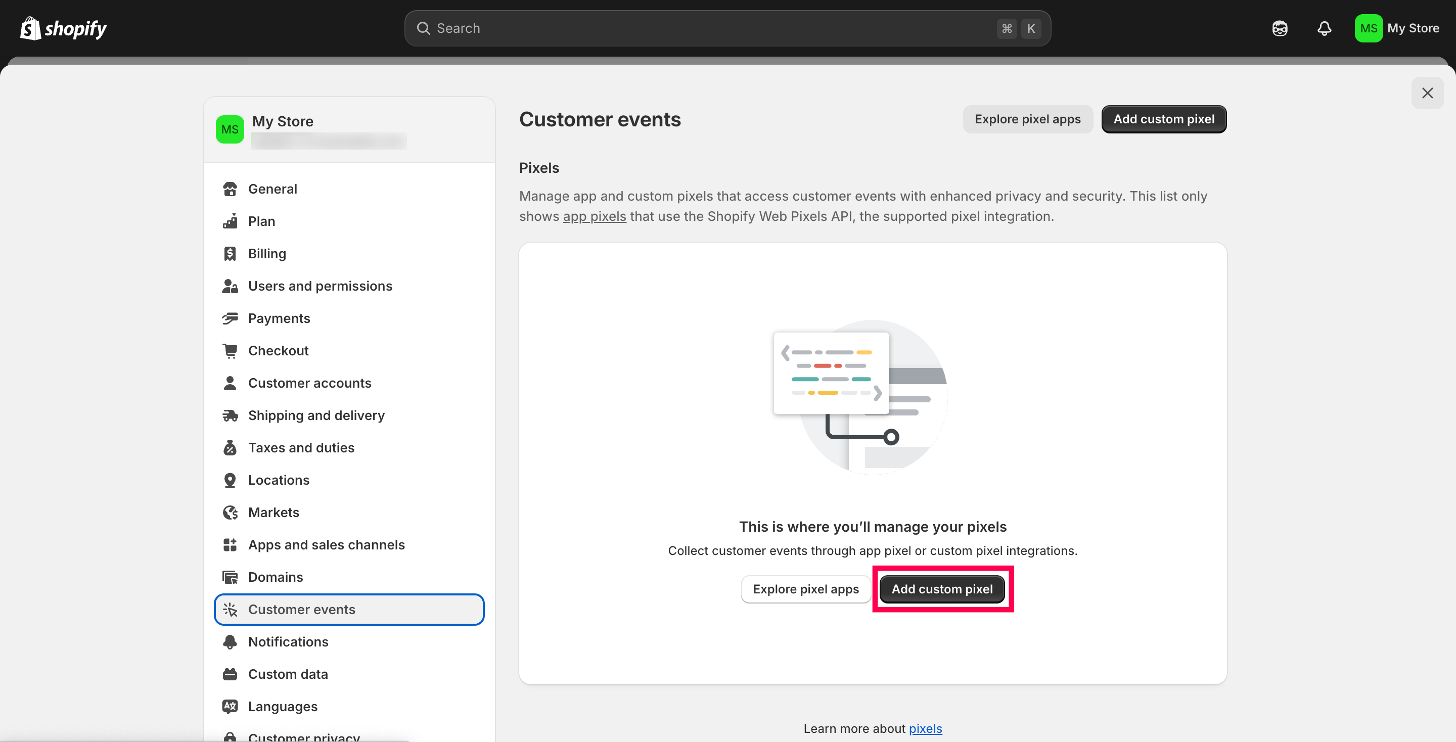 1. Click on Settings > Customer Events > Add Custom Pixel.