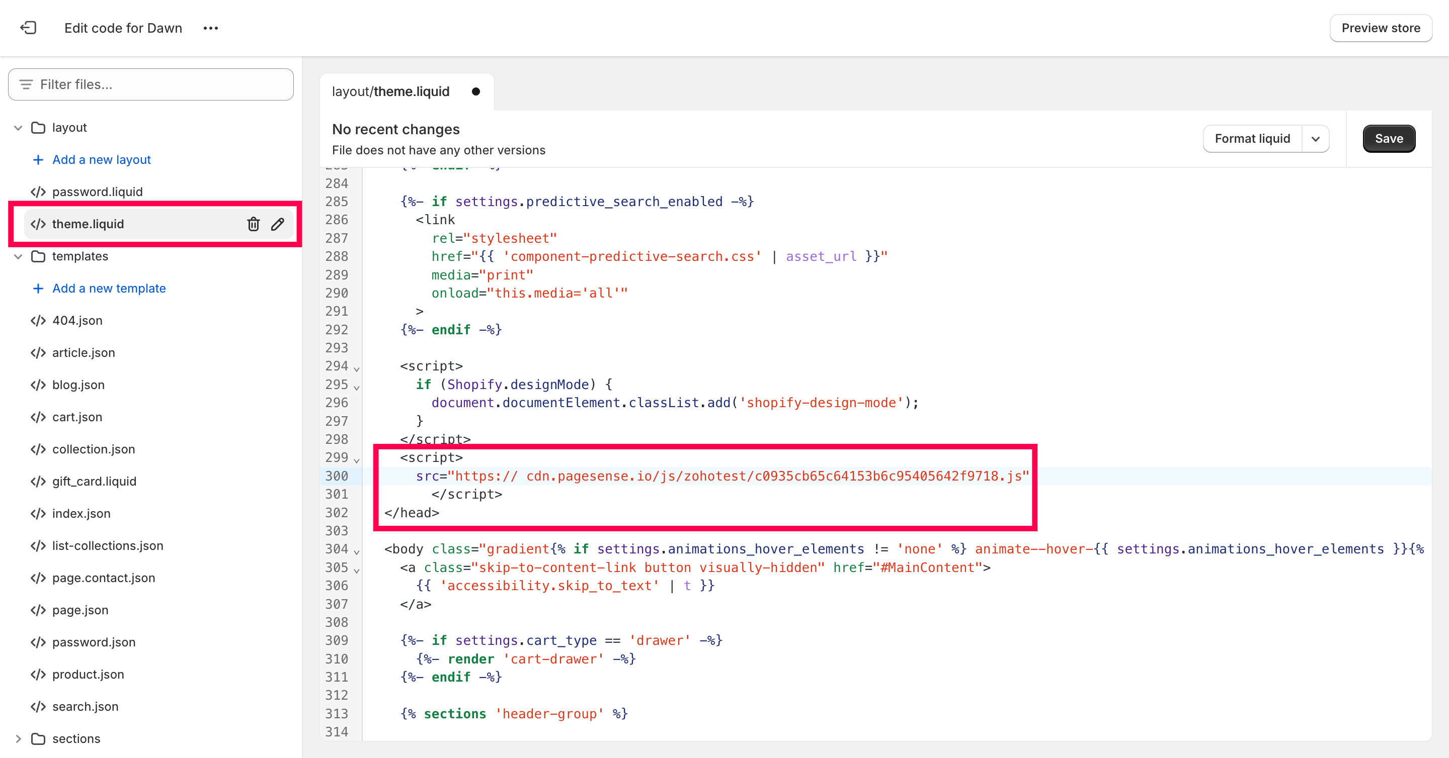 4. Under Layout, select theme.liquid and search for </head> tag on the page.