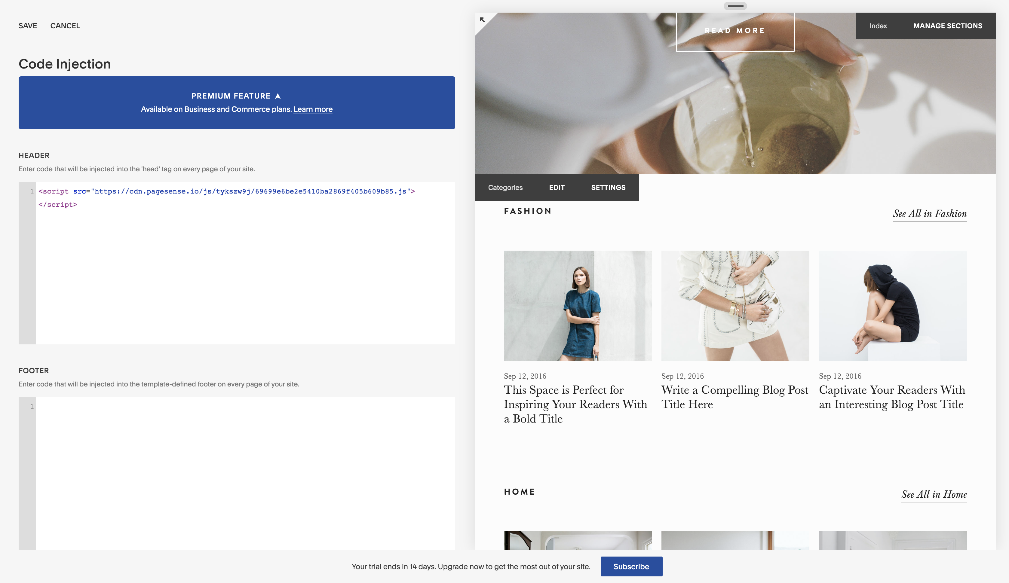 Squarespace is a website building platform that helps you to build creative websites using its amazing drag and drop editor and showcase your work online. This guide helps you with few simple steps to add the PageSense snippet code on your squarespace to connect your websites and start visitor tracking with ease. Once after you add the code, you can use a variety of website testing and optimization tools of PageSense like heatmap, funnel, AB testing, session recordings, etc and even setup business specific goals to track conversions and visitors behavior on different pages of your squarespace sites. Further, PageSense also lets you integrate with traditional website analytics tools like google analytics to study deeper metrics of your site.