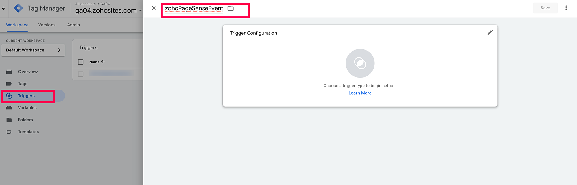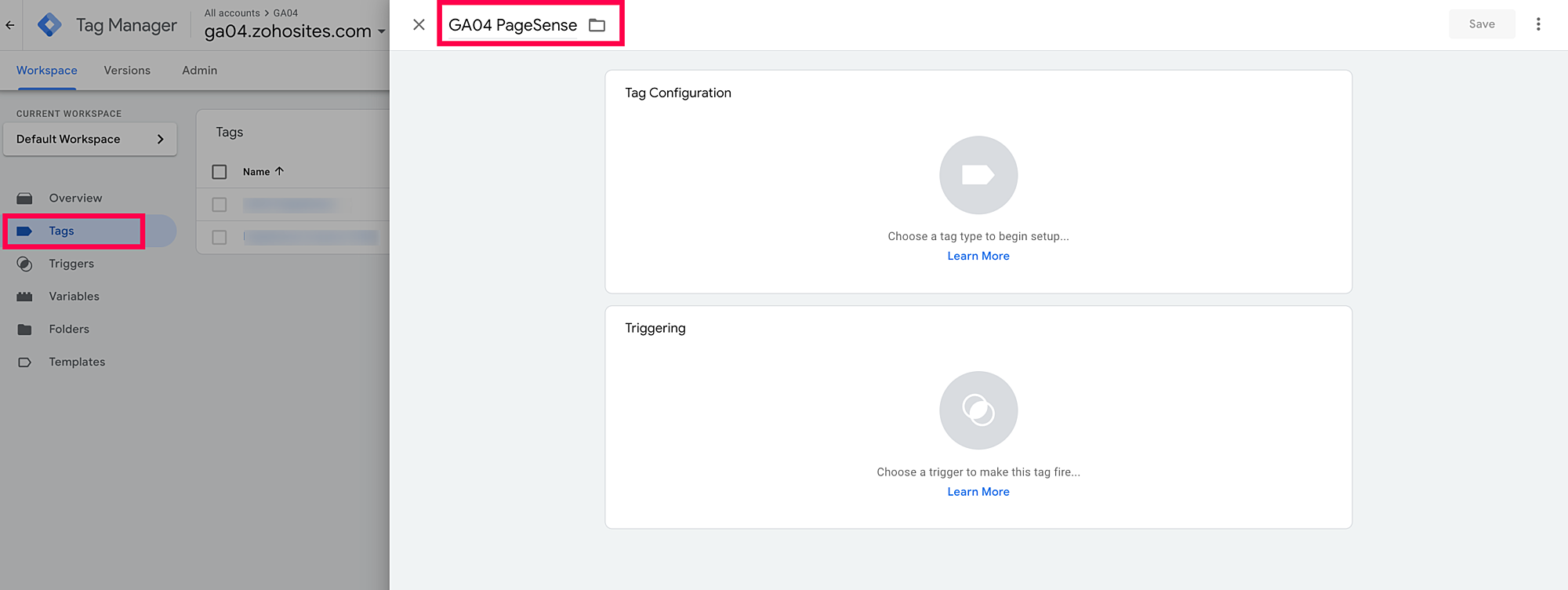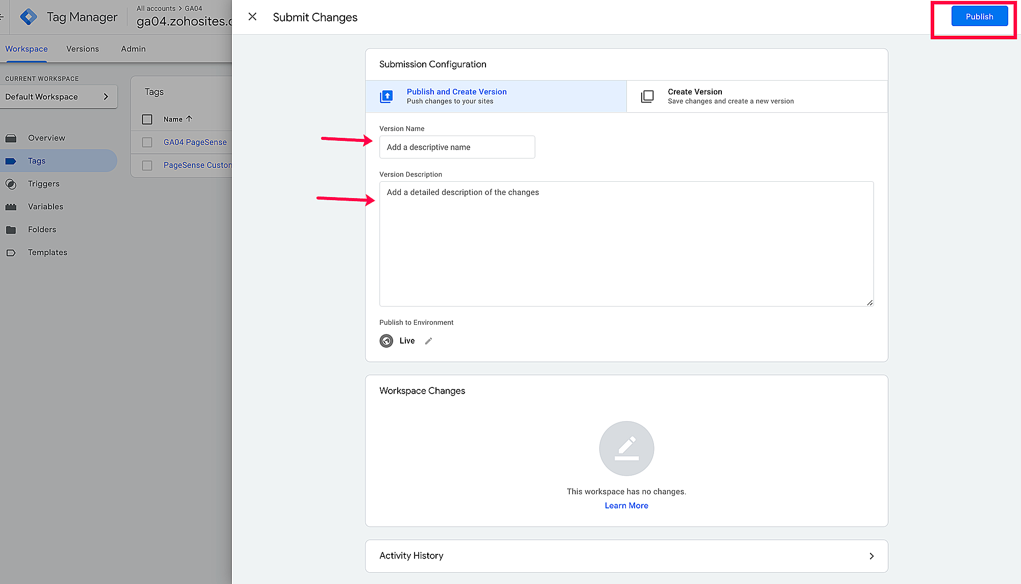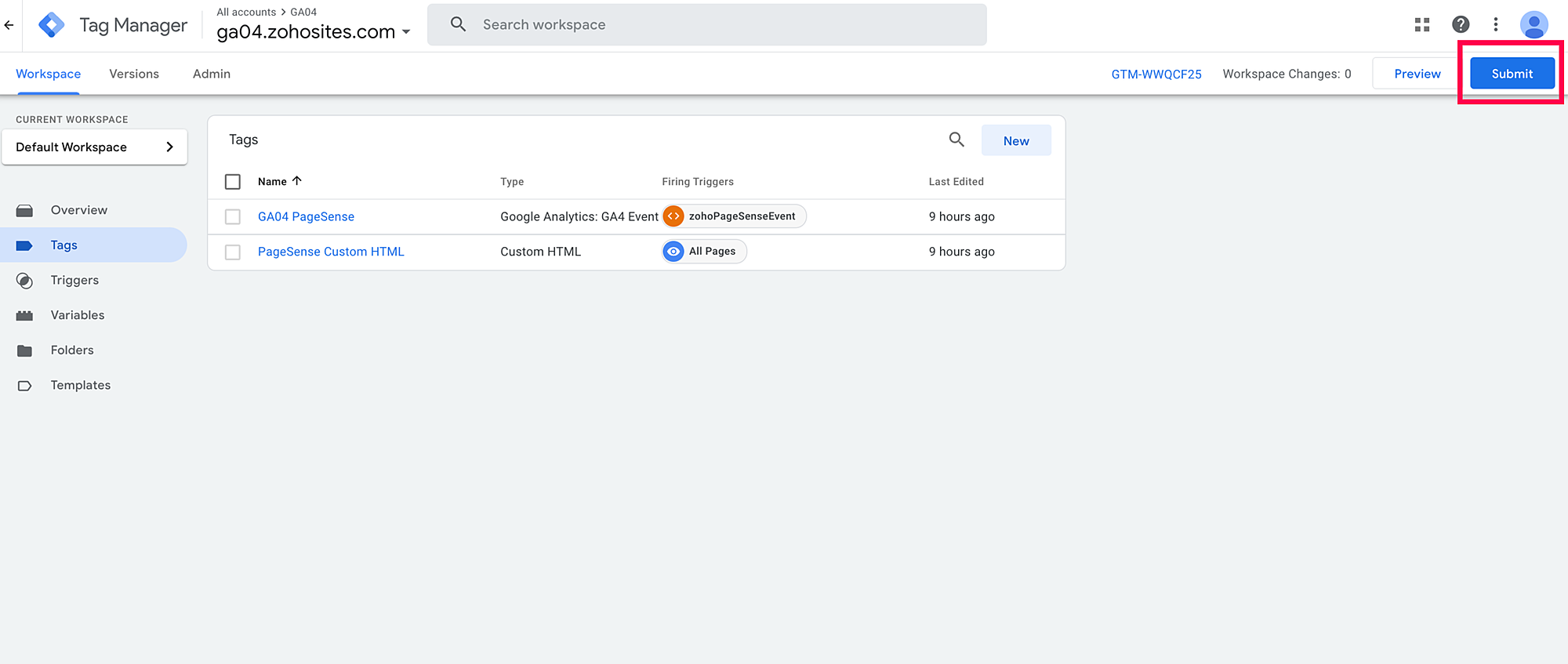- Prior to following the steps below, log into your Google Tag Manager account and choose the Workspace you want to integrate with Zoho PageSense.