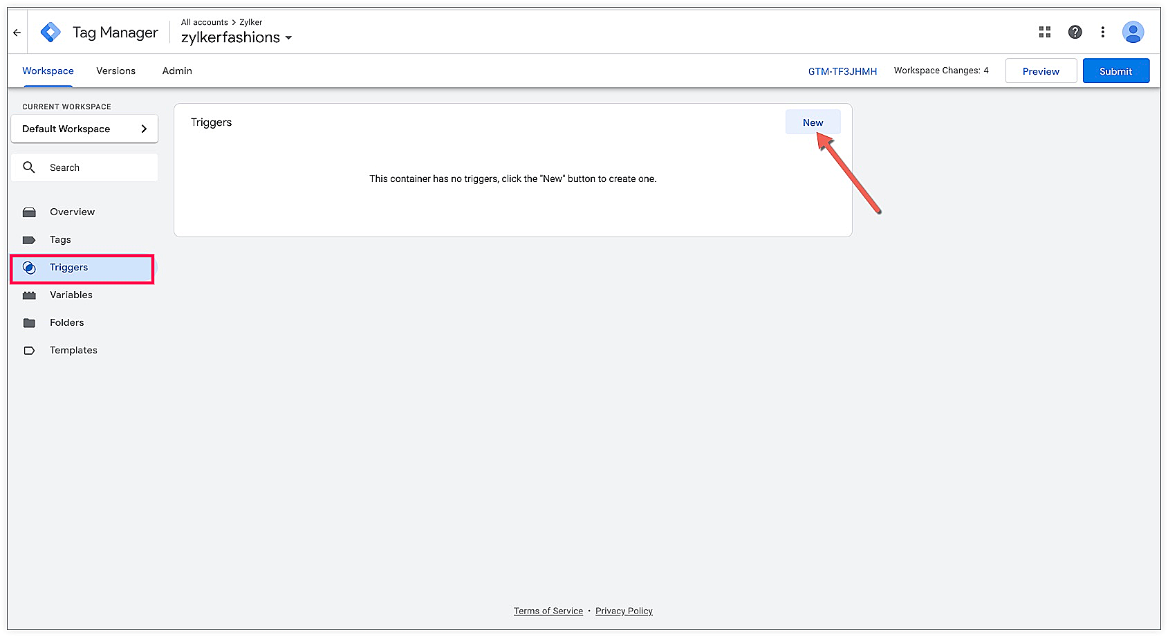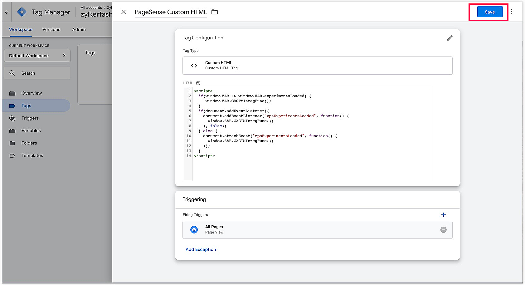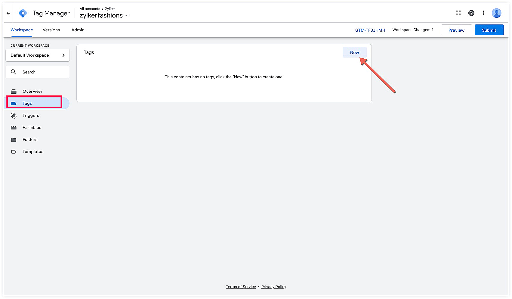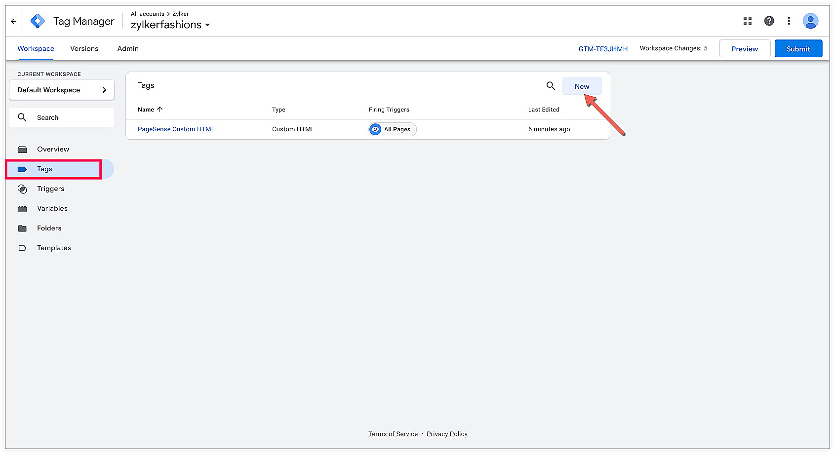 - Prior to following the steps below, log into your Google Tag Manager account and choose the Workspace you want to integrate with Zoho PageSense.