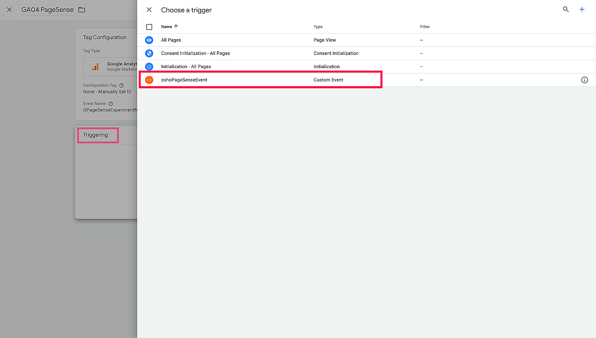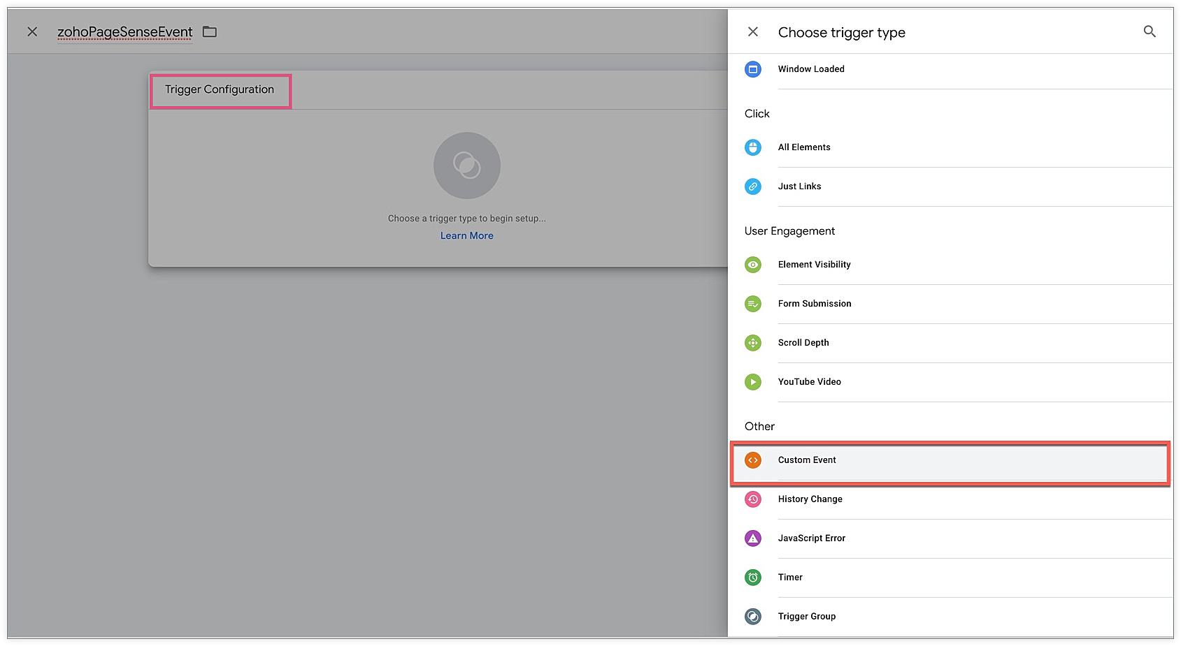 5. Under Triggering, select Custom Event and zohoPageSenseEvent from the list.