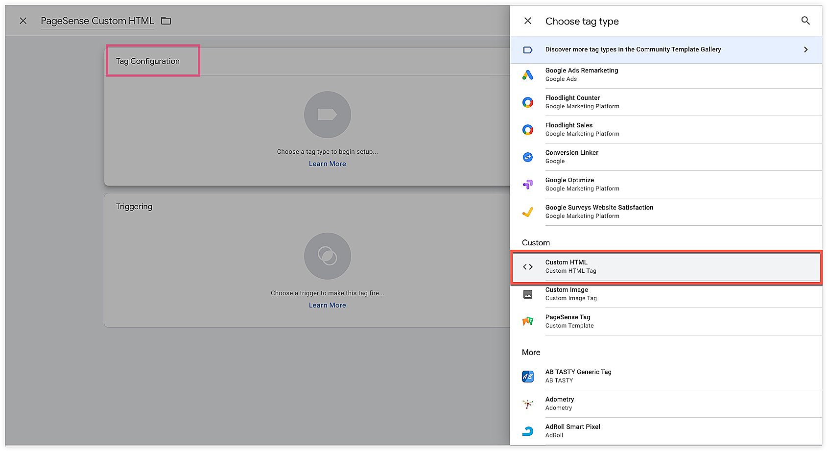 3. Under Tag Configuration, select Custom HTML from the list of tag types displayed.