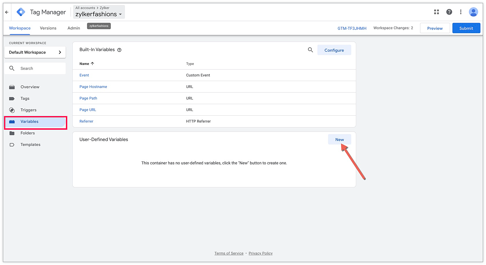 5. To set up your second Data Layer Variable, navigate to the left panel, click Variables and click New.