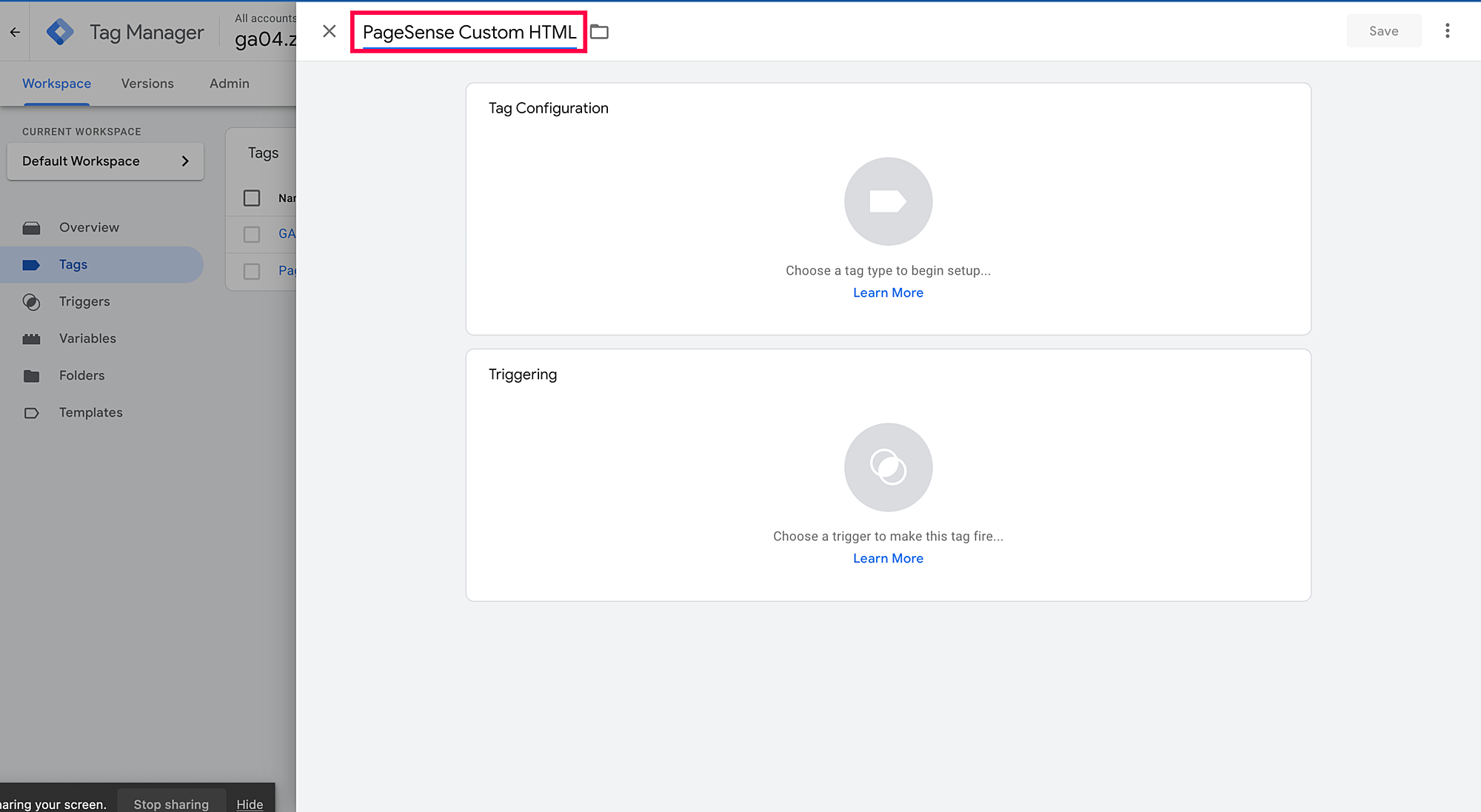 2. Under Tags, enter your tag name as 'GA04 PageSense' in the Untitled Tag field,