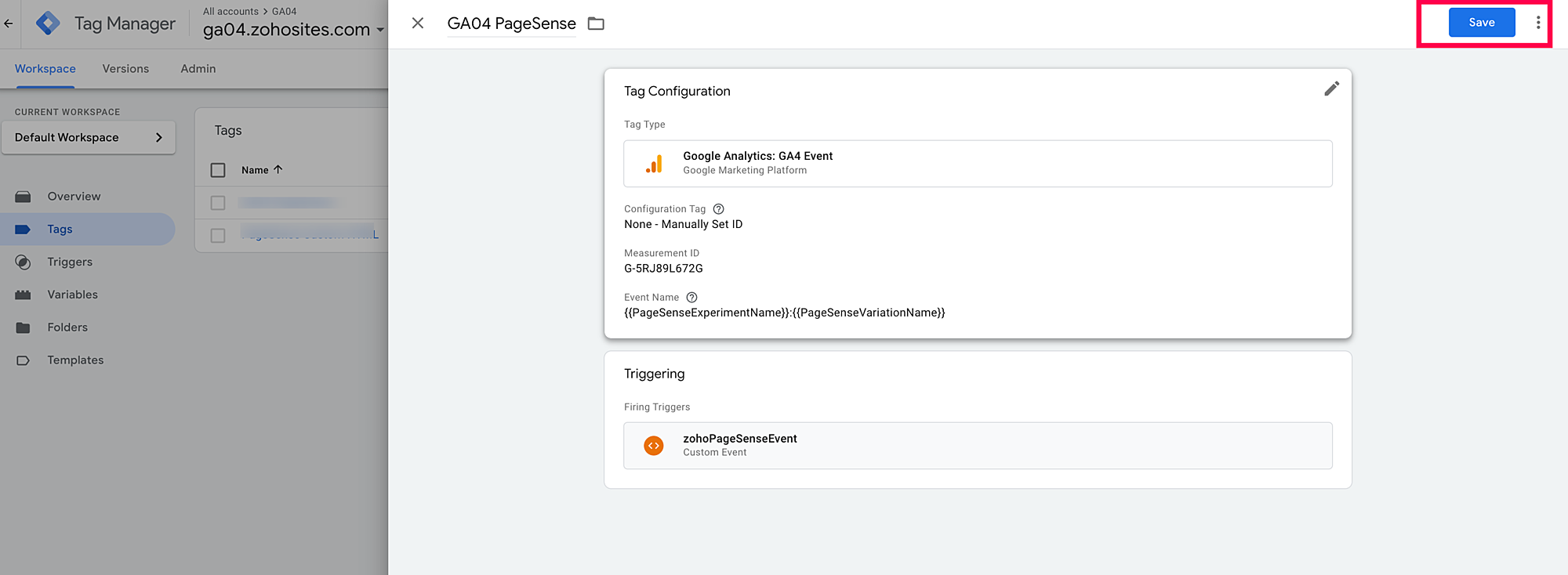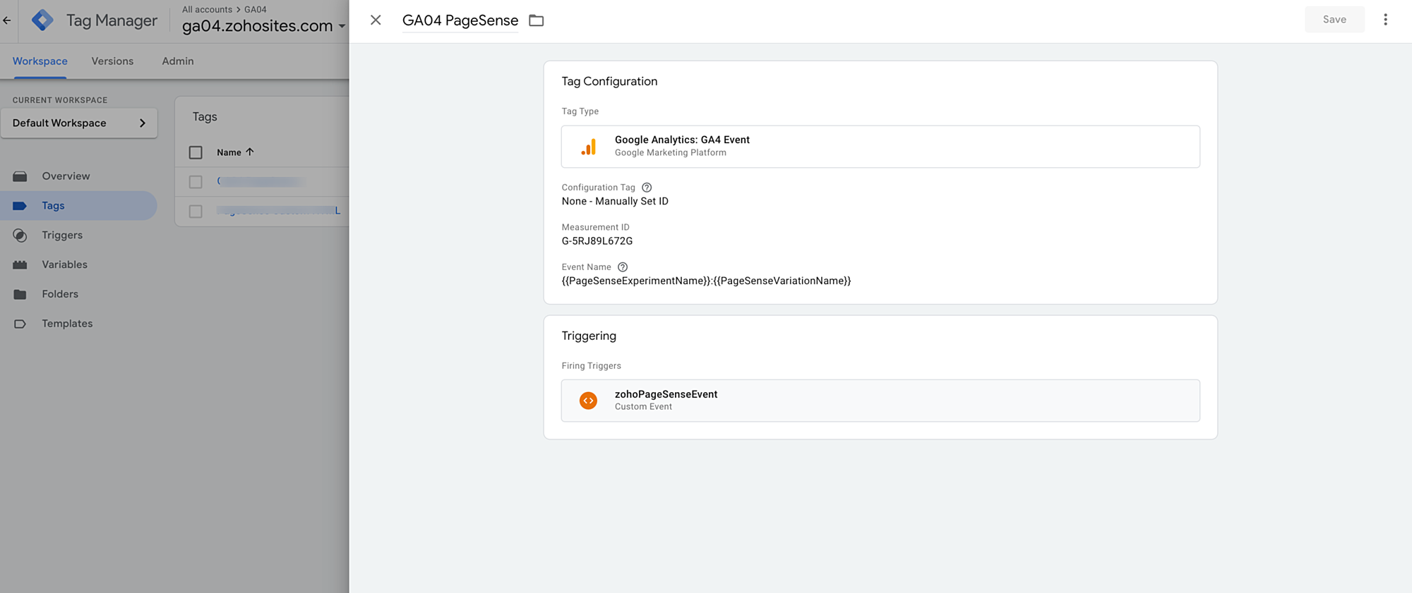 To complete the setup process in GTM, you need to create a tag. These GA04 tags consist of code snippets that ultimately transmit the data captured by the variables triggered by 'zohoPageSenseEvent' to your Google Analytics account. All the information gathered from the ongoing A/B Test and Split URL Test experiments conducted through PageSense will then be pushed over to Google Analytics.