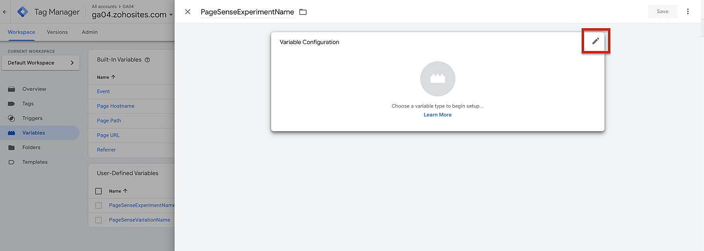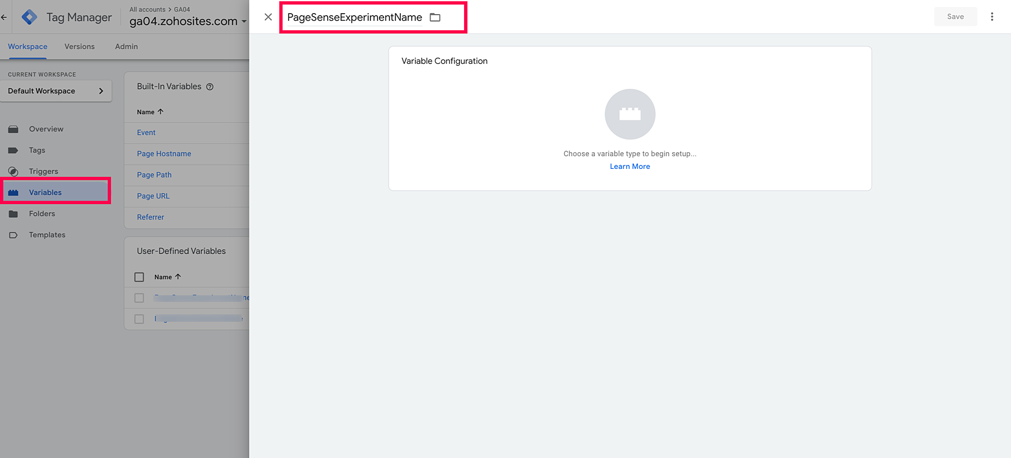 2. Enter your variable name as 'PageSenseExperimentName' in the Untitled Variable field.