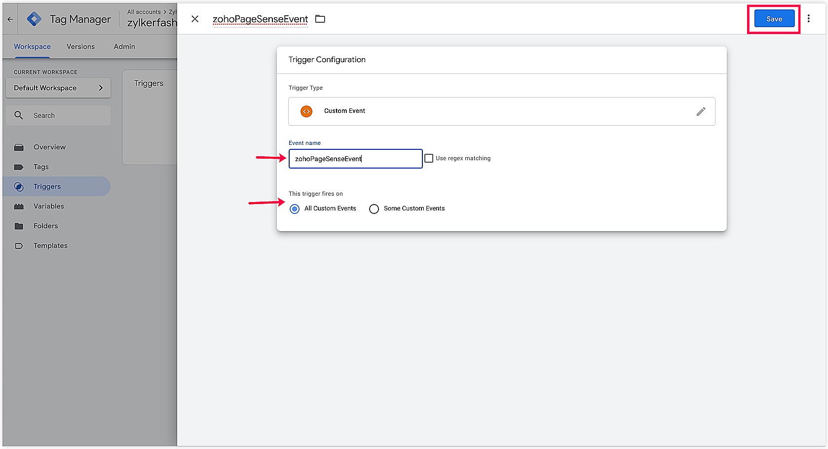4. Enter your Event name as ‘zohoPageSenseEvent’ , select the trigger All Custom Events and click Save.
