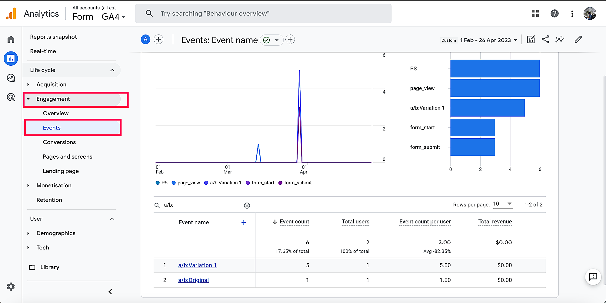 Login to your GA04 account, on the left panel, click Engagement, then Events. You can view a summary of your test results as shown below.