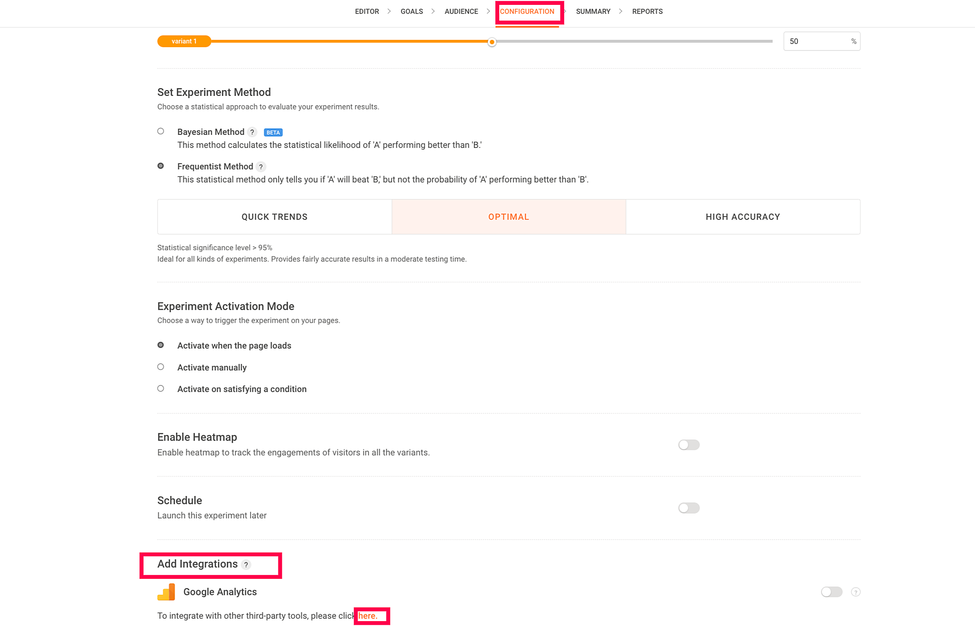 3. Scroll down to Integrations and click the toggle to activate Google Analytics. Click here to be redirected to the integration section which you can enable Google Analytics from the list of available integrations.