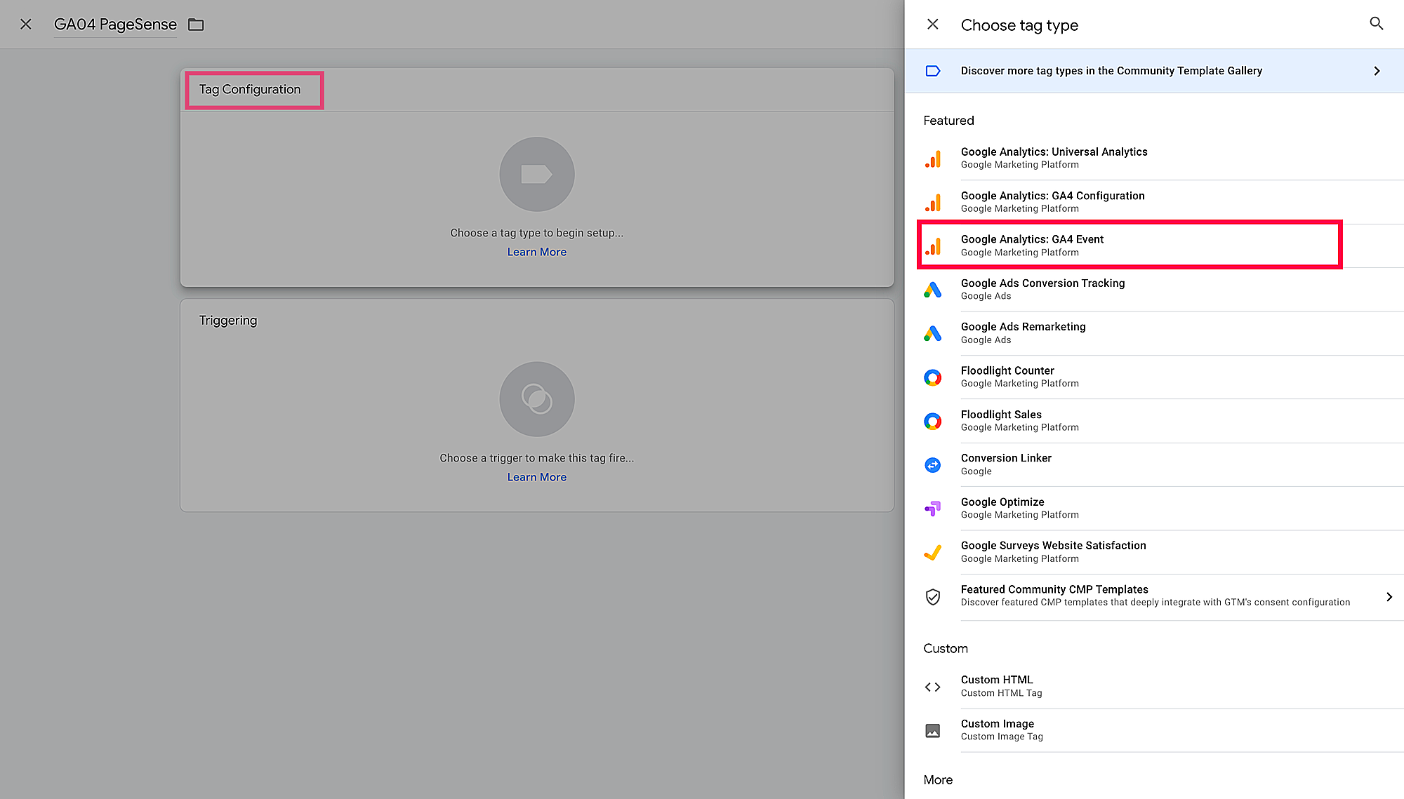 3. Under Tag Configuration select Google Analytics: GA4 Event from the displayed list.