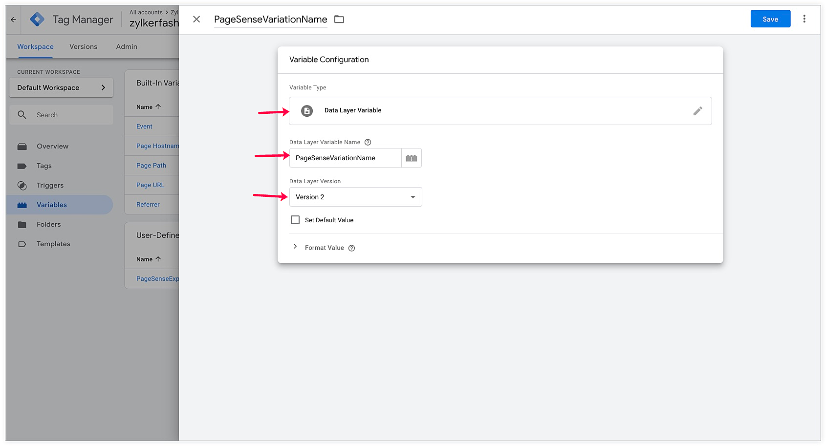 Next, we need to create two Data Layer Variables in GTM. They help transfer the data of every test and variation created, into GA04. These variables are defined by the PageSense snippet.
