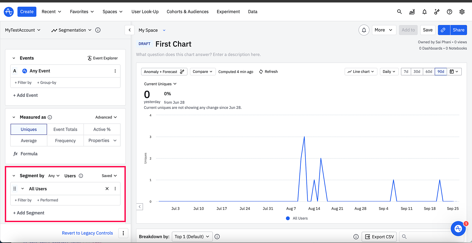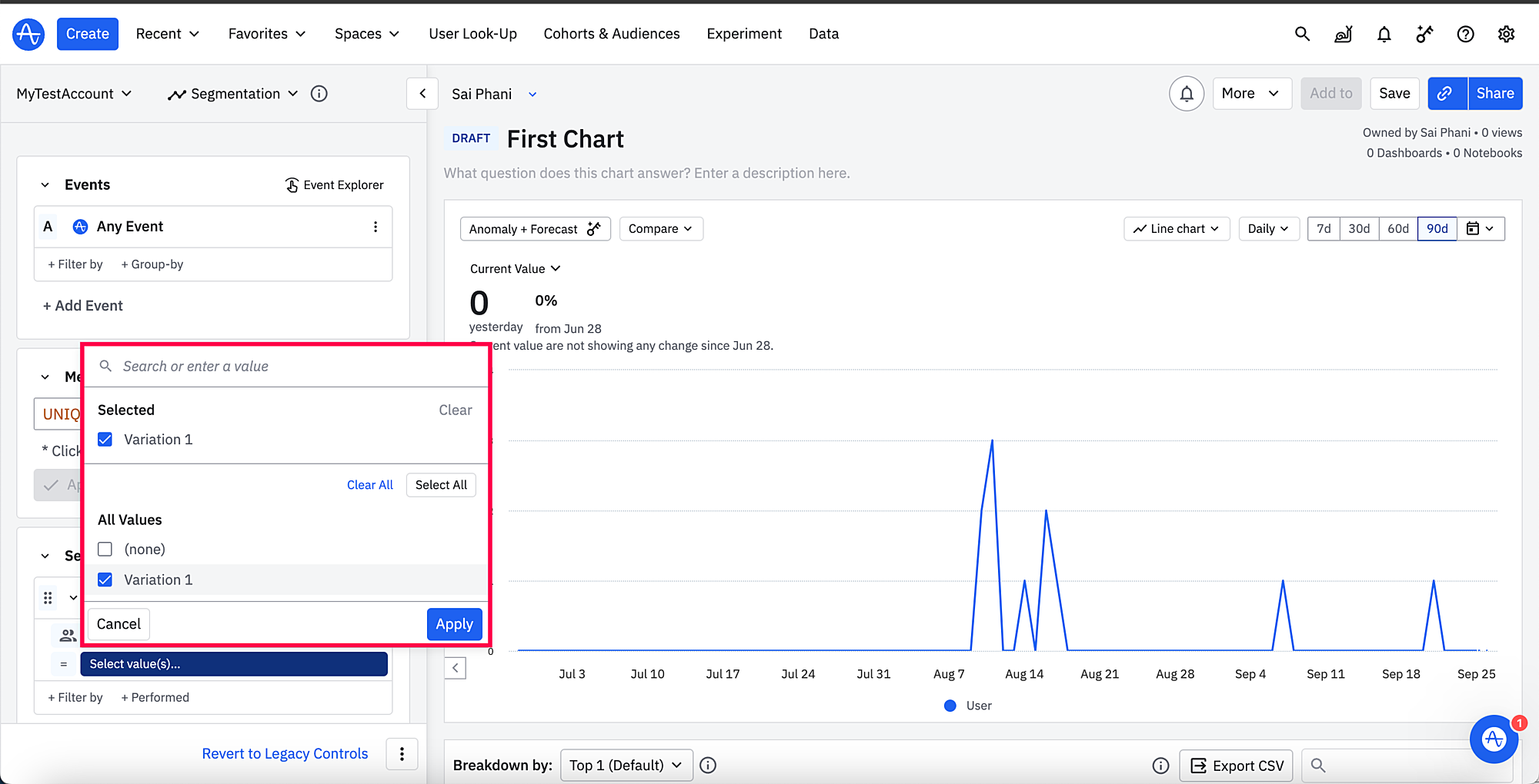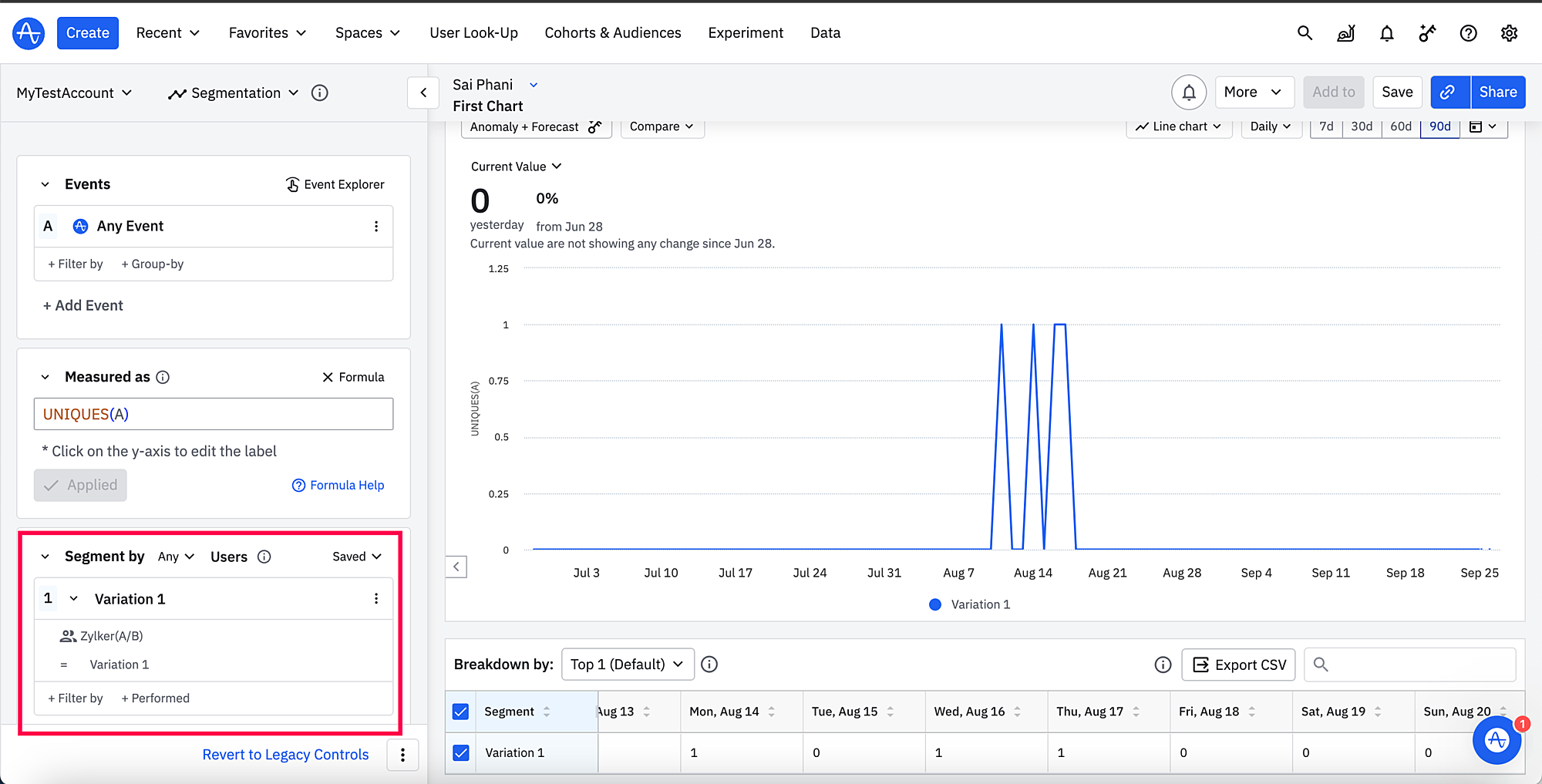 6. Once you enter Amplitute, the variations you have created in PageSense will reflect under Segment by in the bottom-left corner.