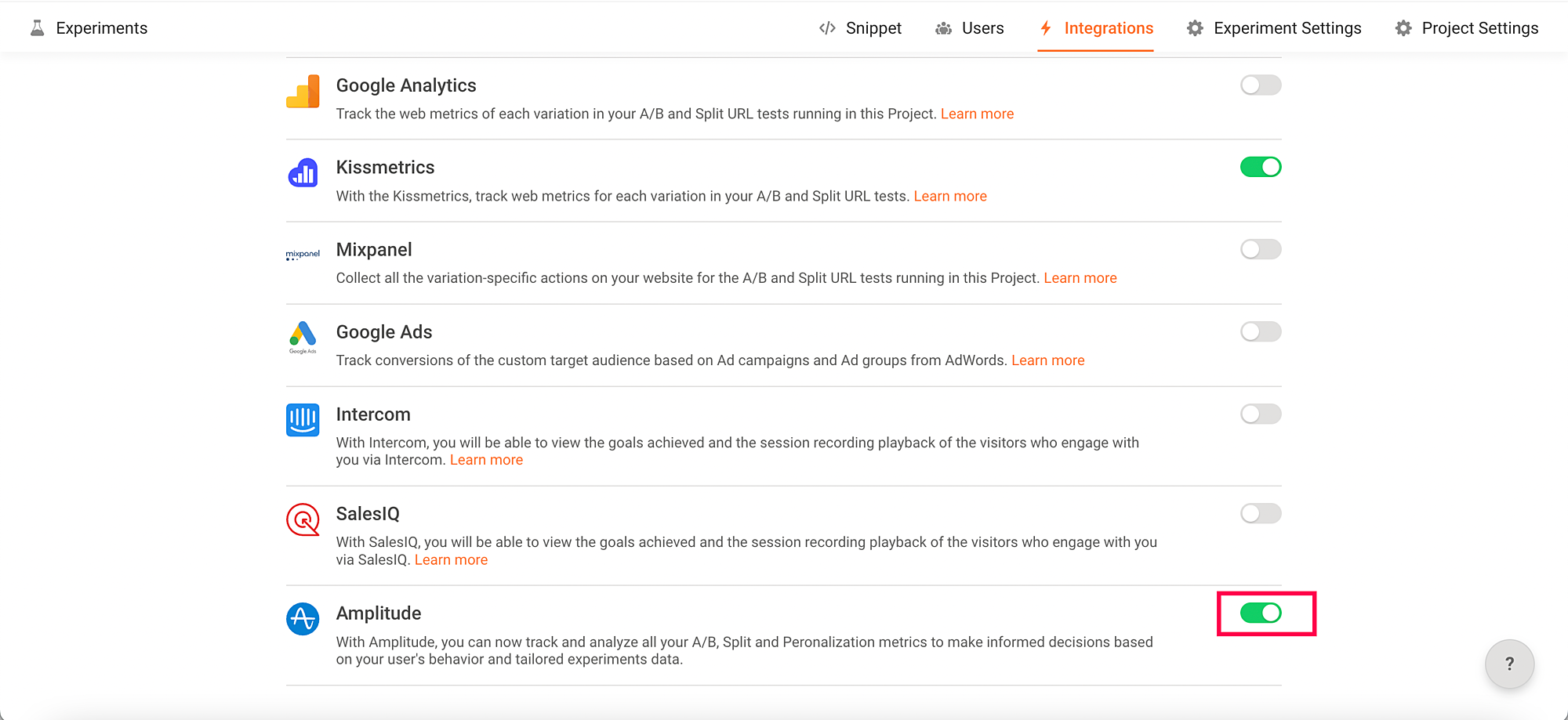 5. Click Add Integrations, then enable the toggle to integrate Amplitude.