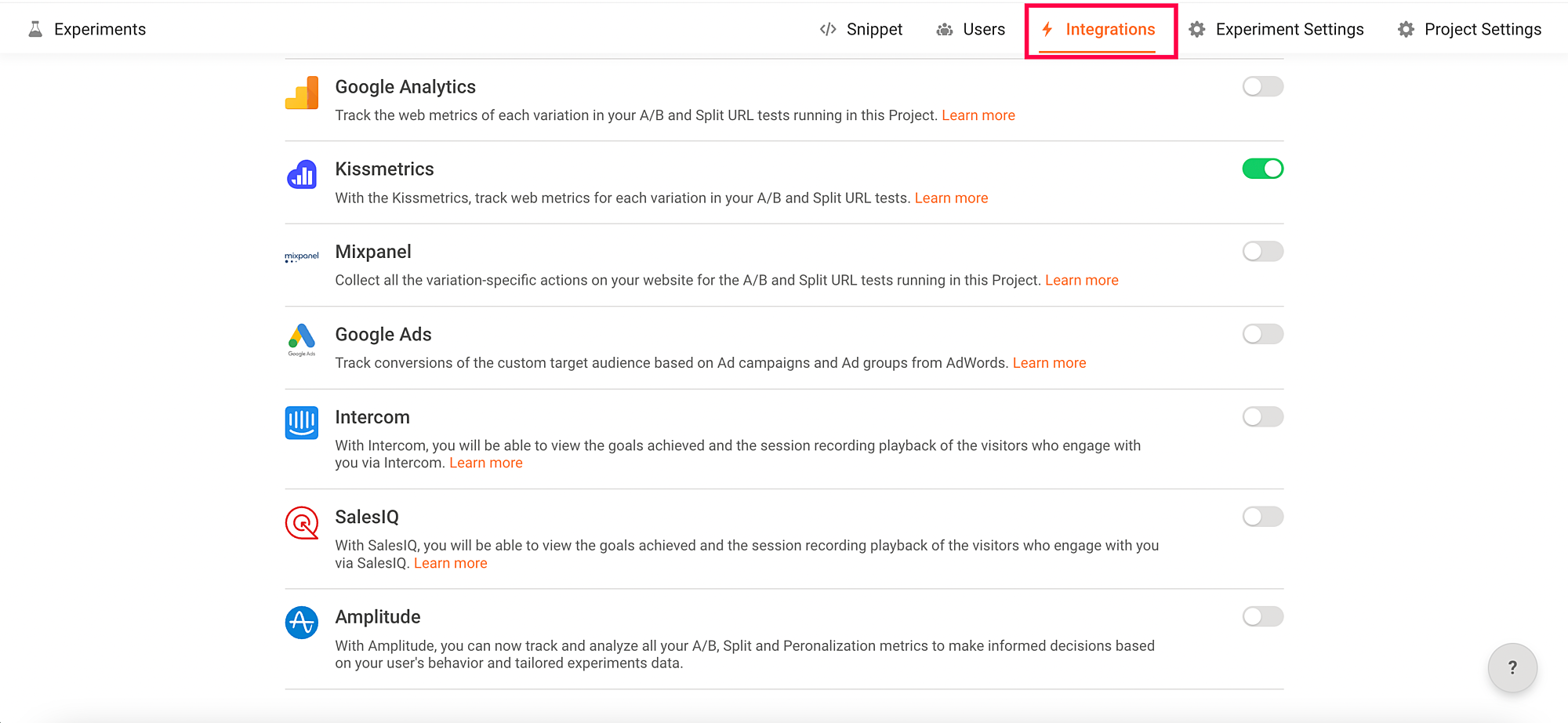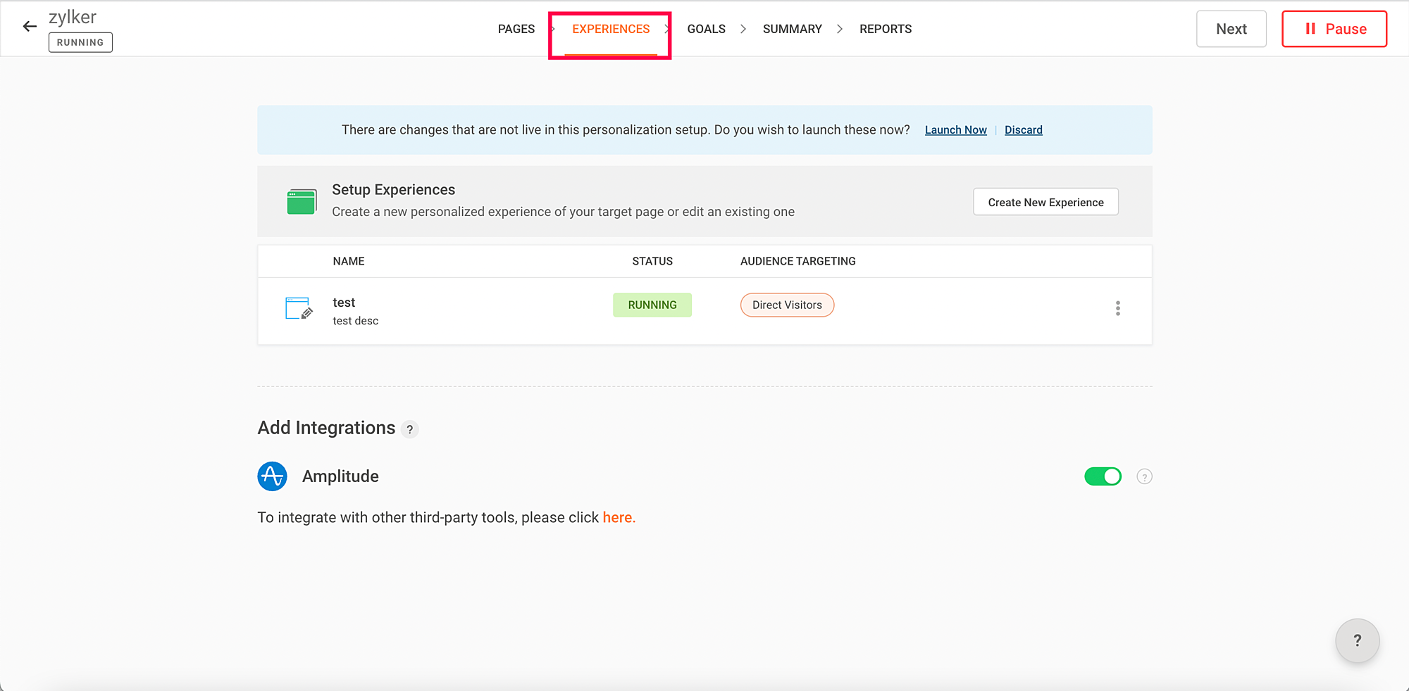 3. Select the Personalization, A/B, or Split URL experiment for which you want to view reports in Amplitude.