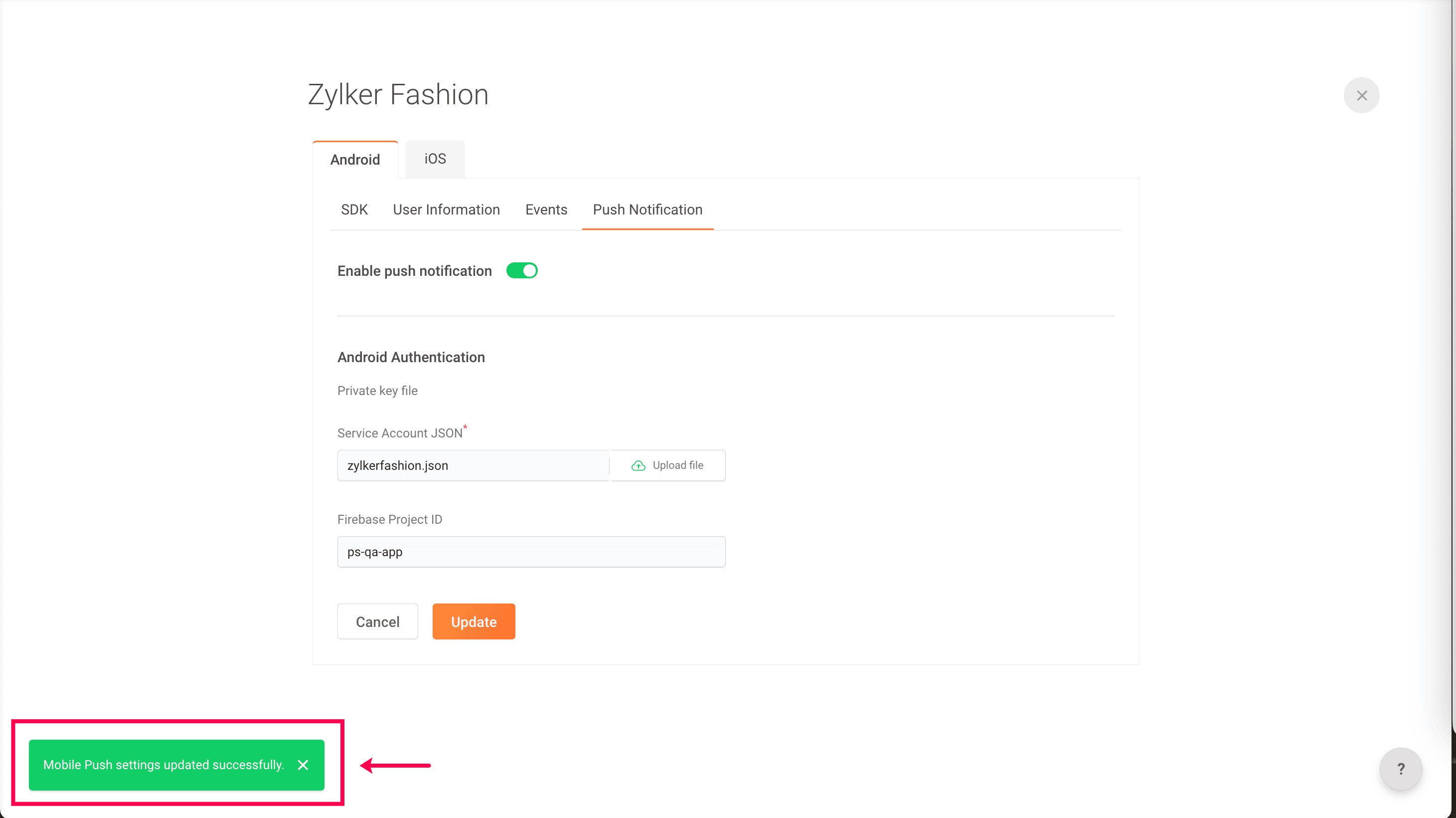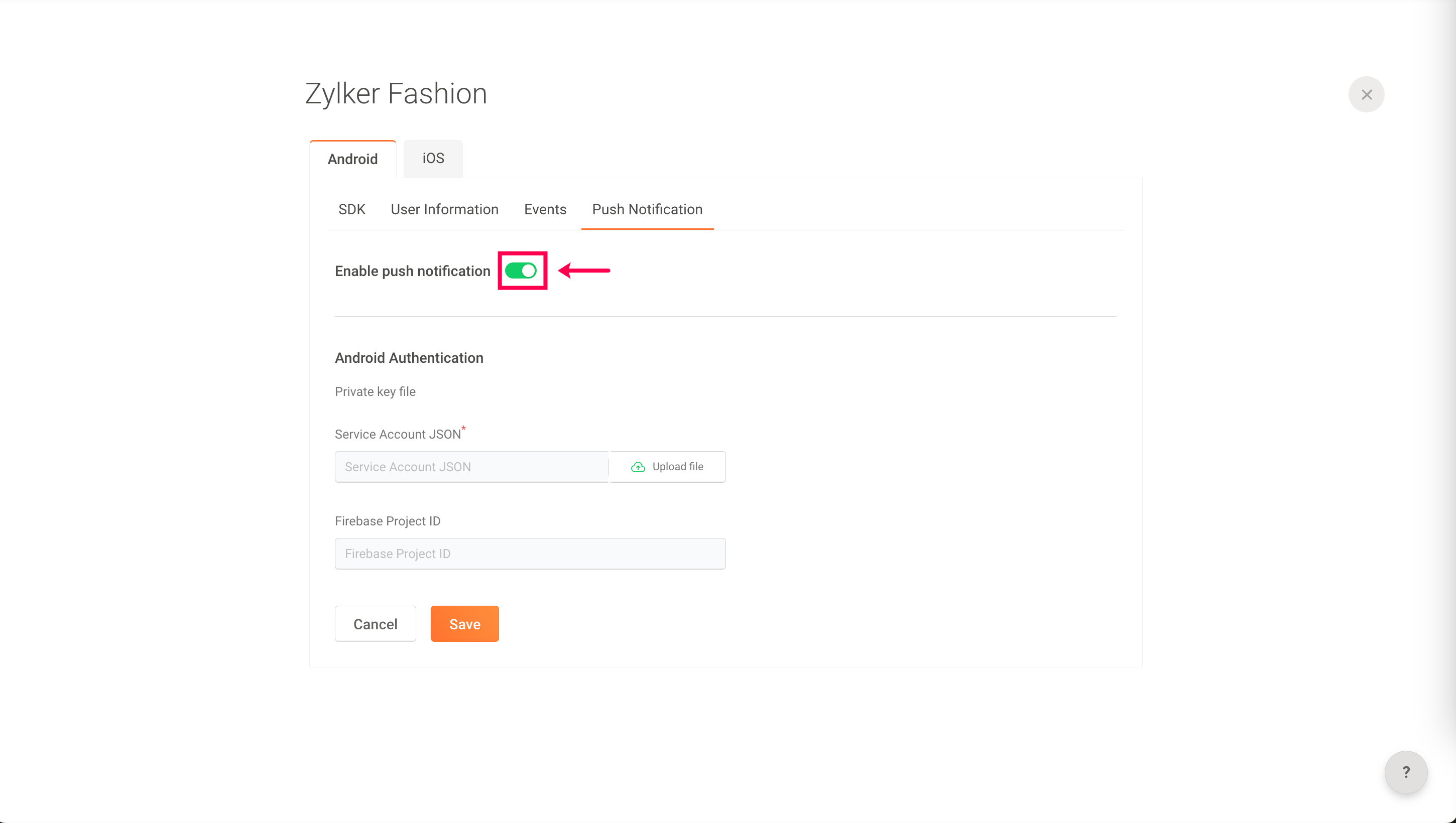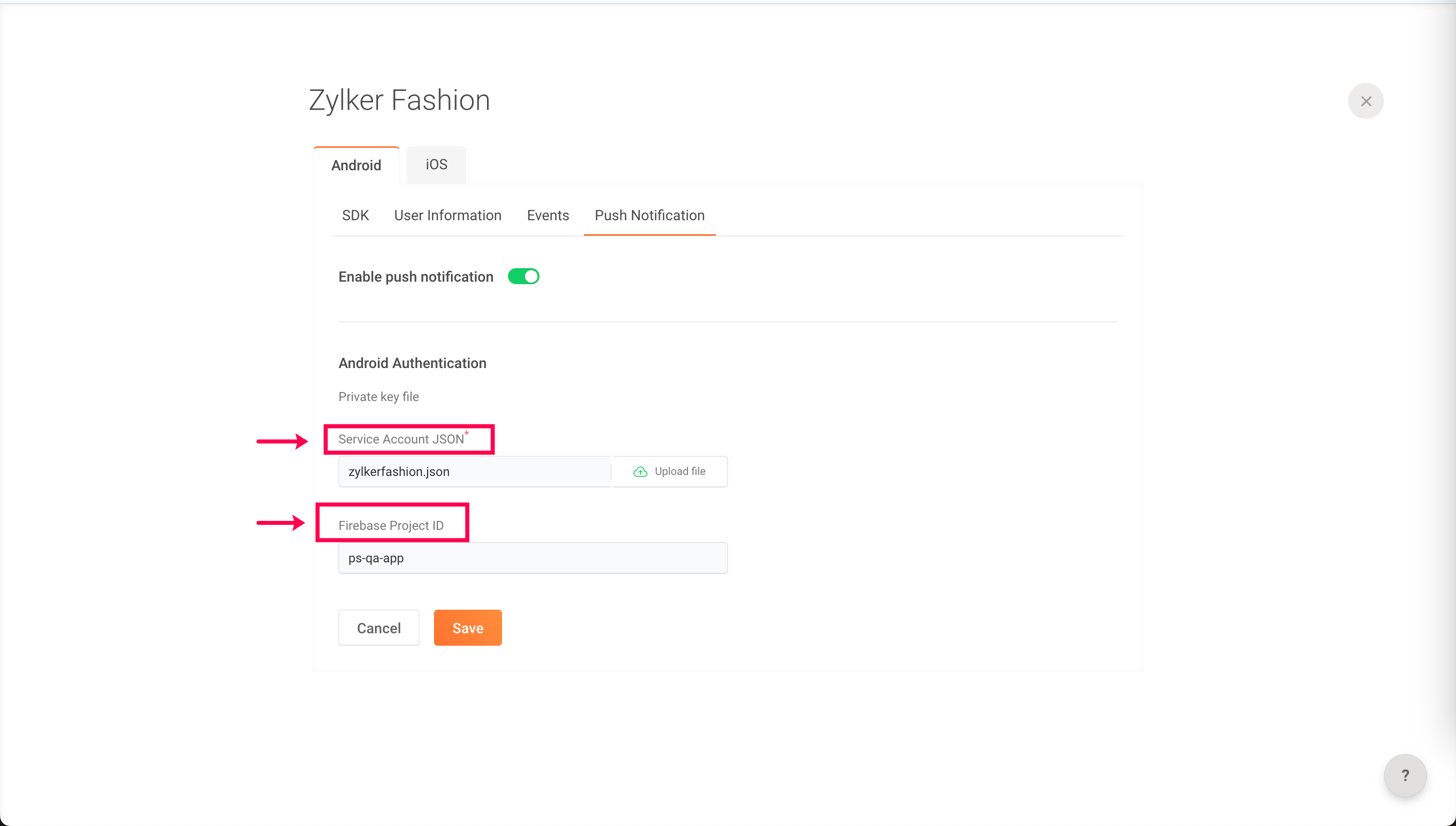 7: Once you upload your JSON file, your Firebase Project ID will be fetched automatically.