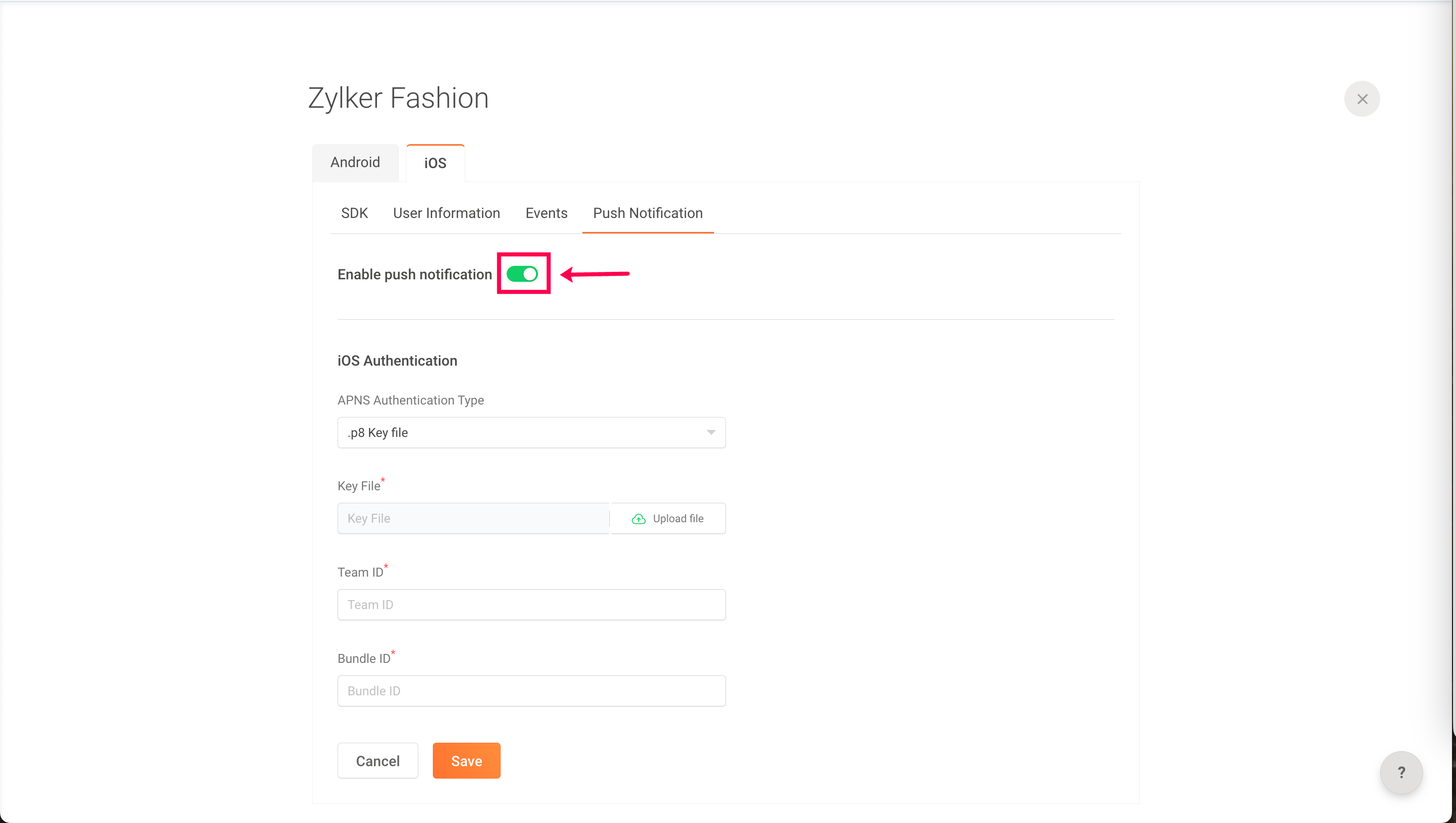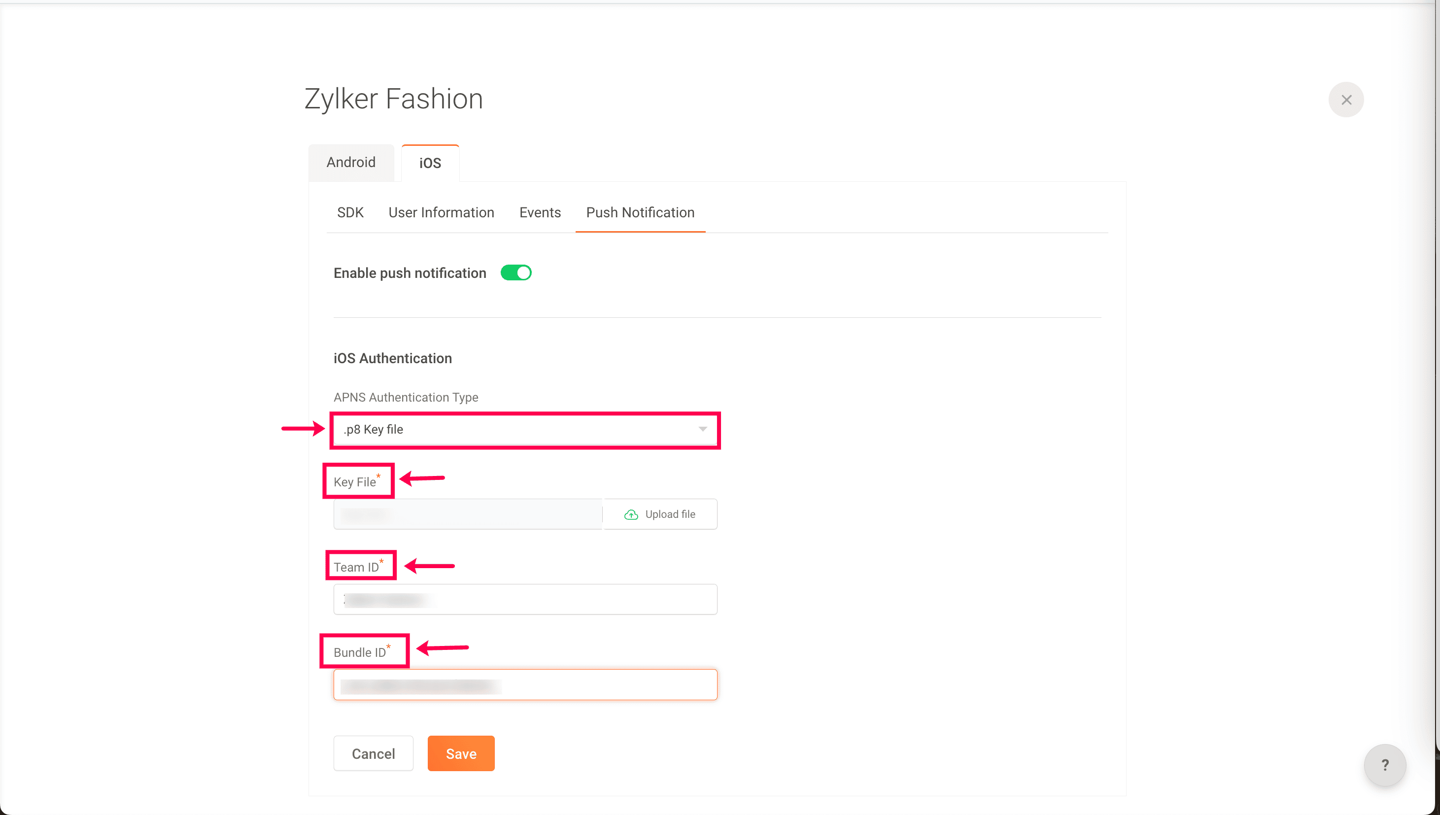 6. If you choose .p8 key file, upload your Key file, and enter your team and bundle ID.