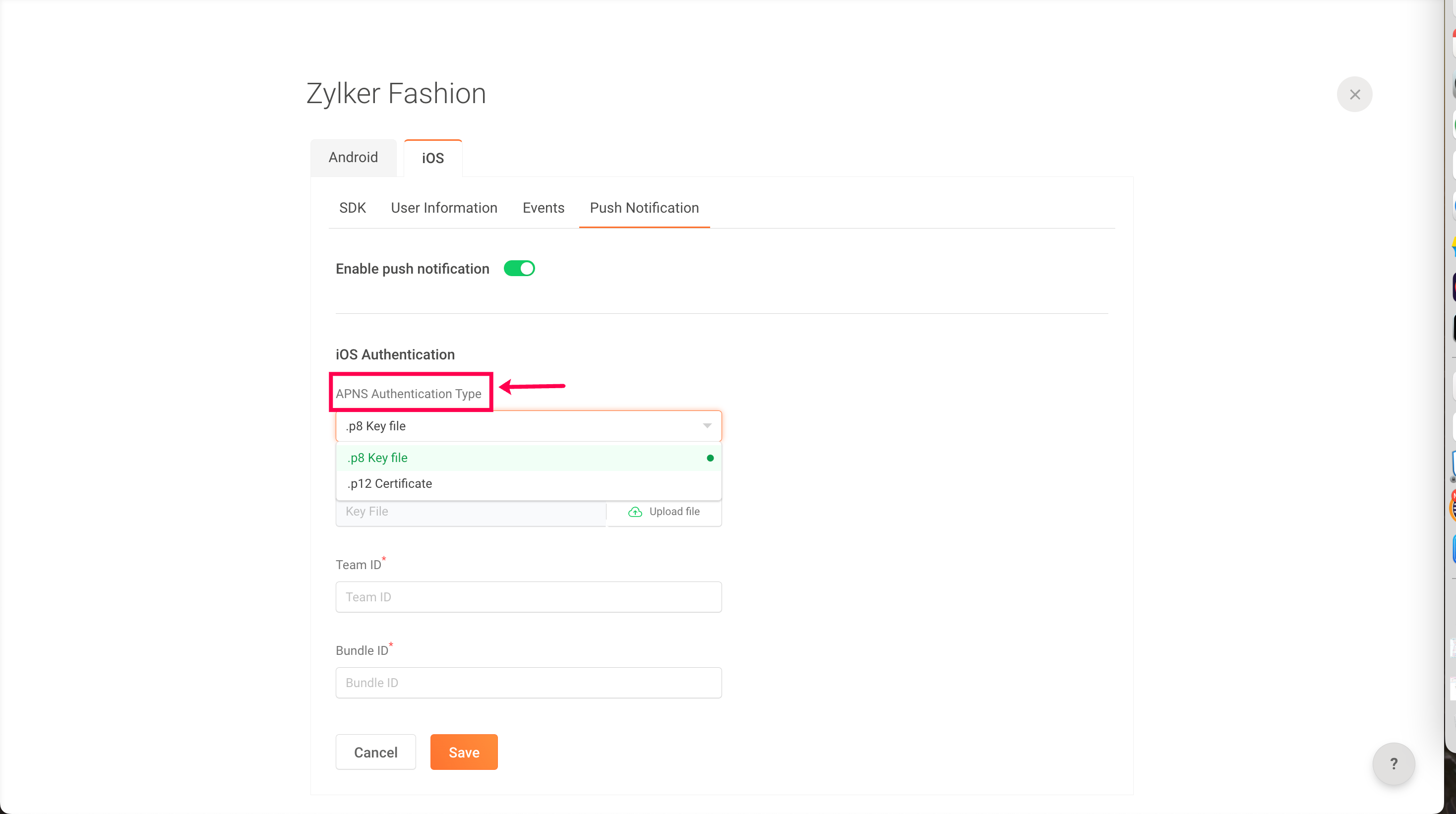 5: Under APNS Authentication Type, choose whether you want to use the .p8 key file or .p12 certificate.