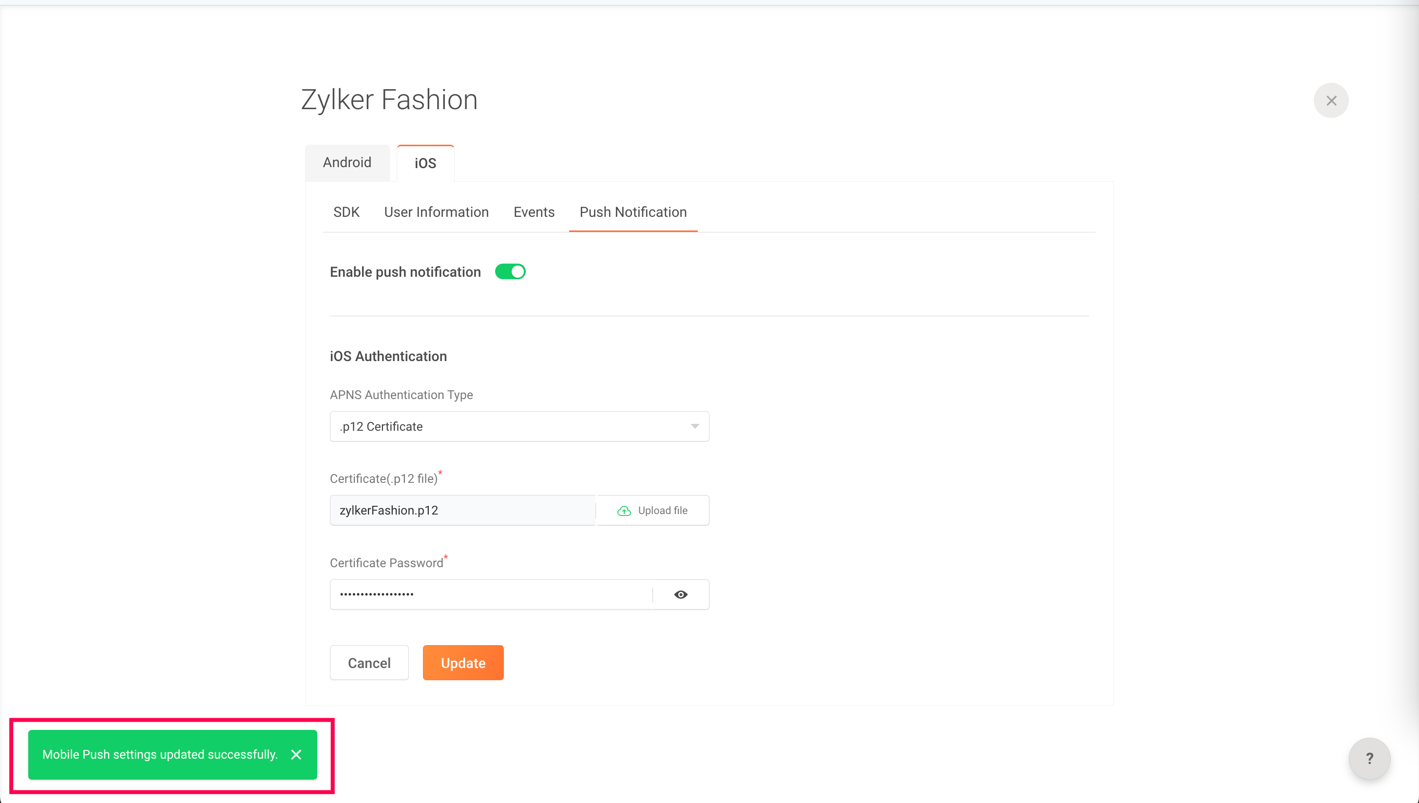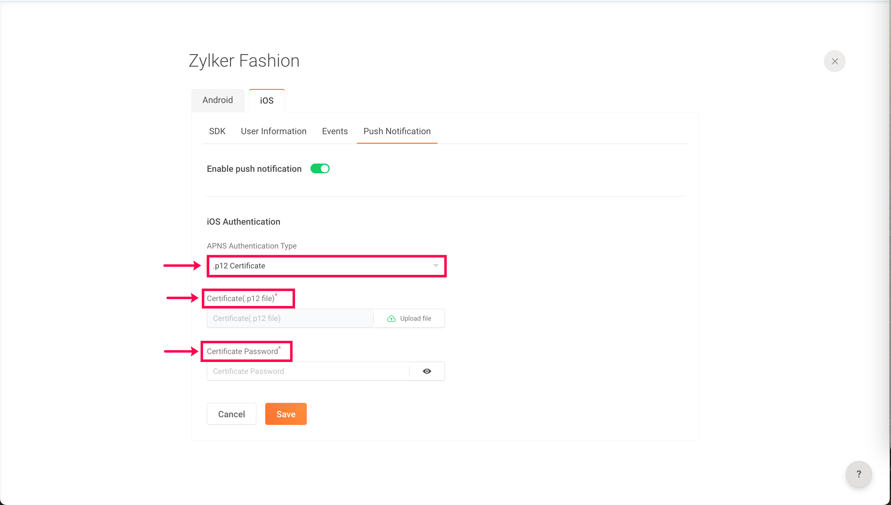 8: If you choose .p12 certificate, upload your Certificate file and enter your password.