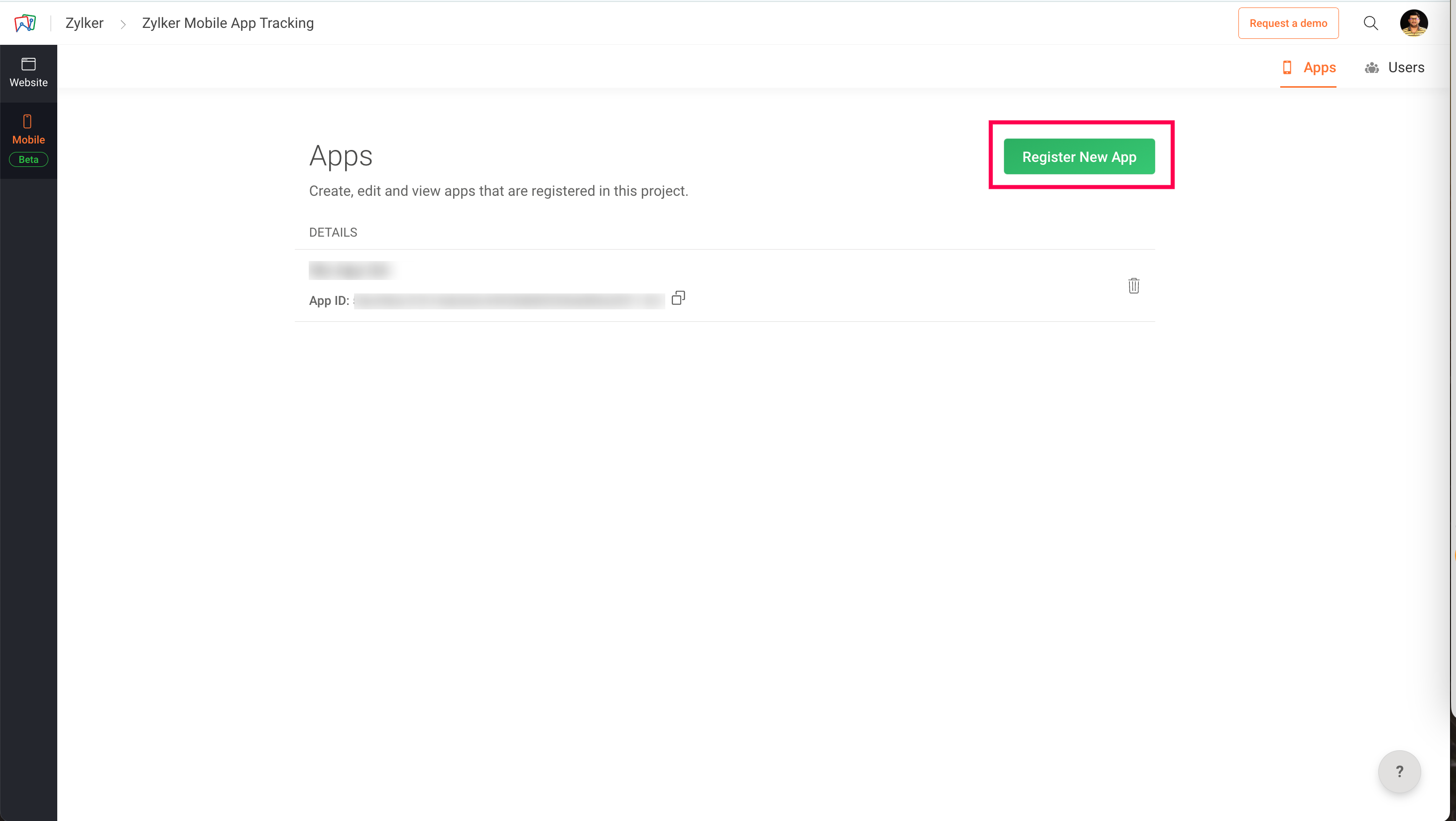 3. Click on Register New App and give your app a unique name.