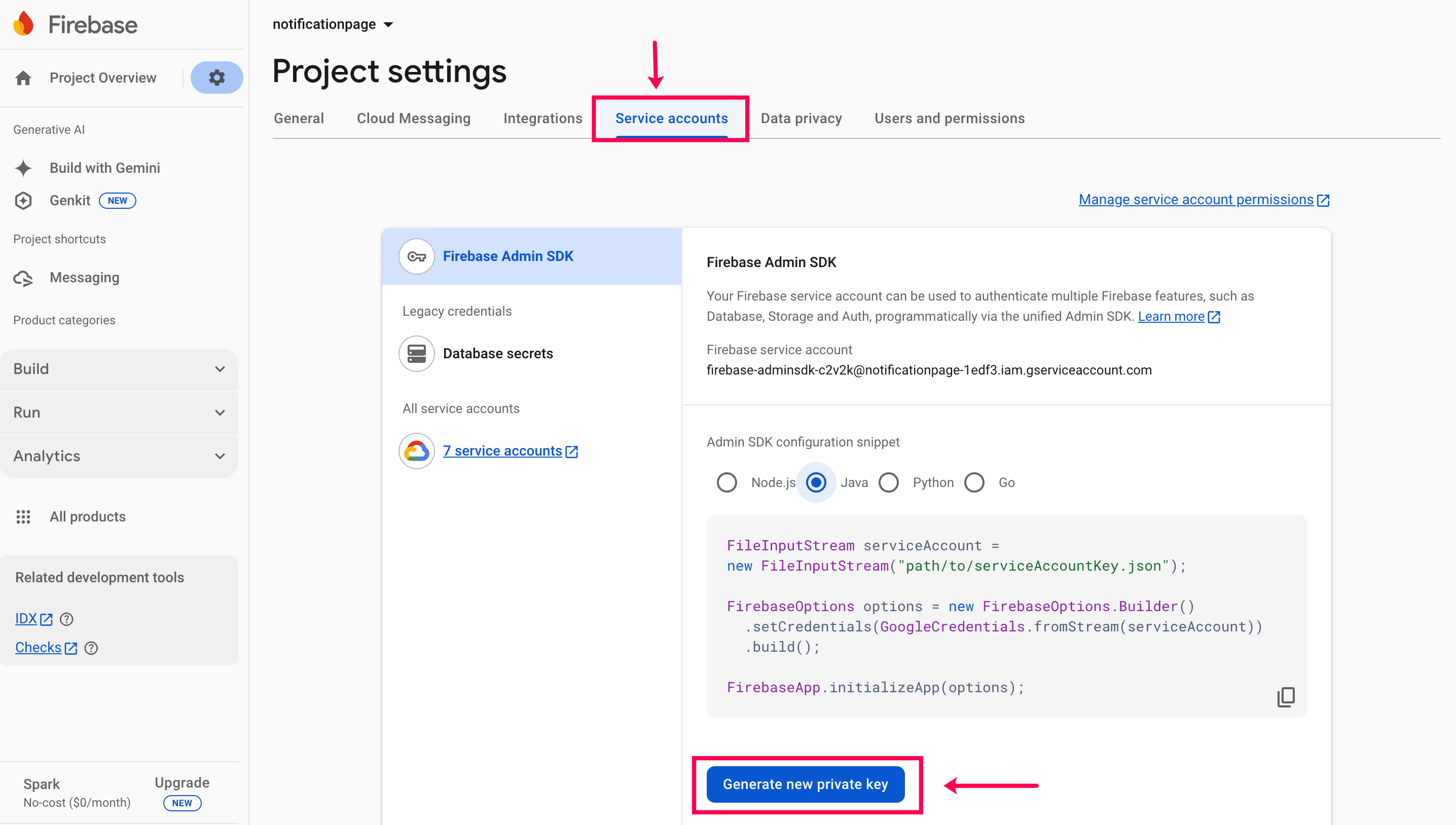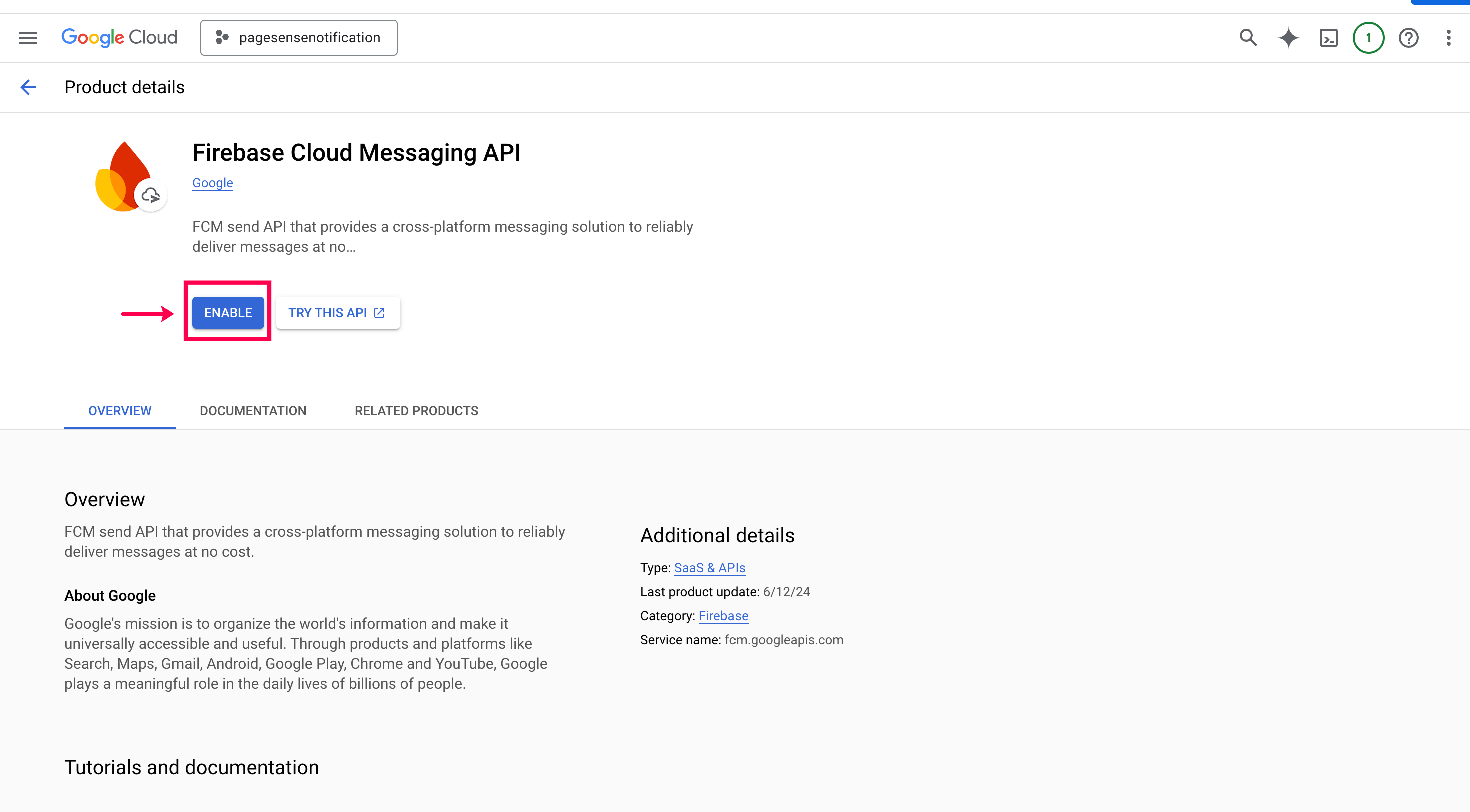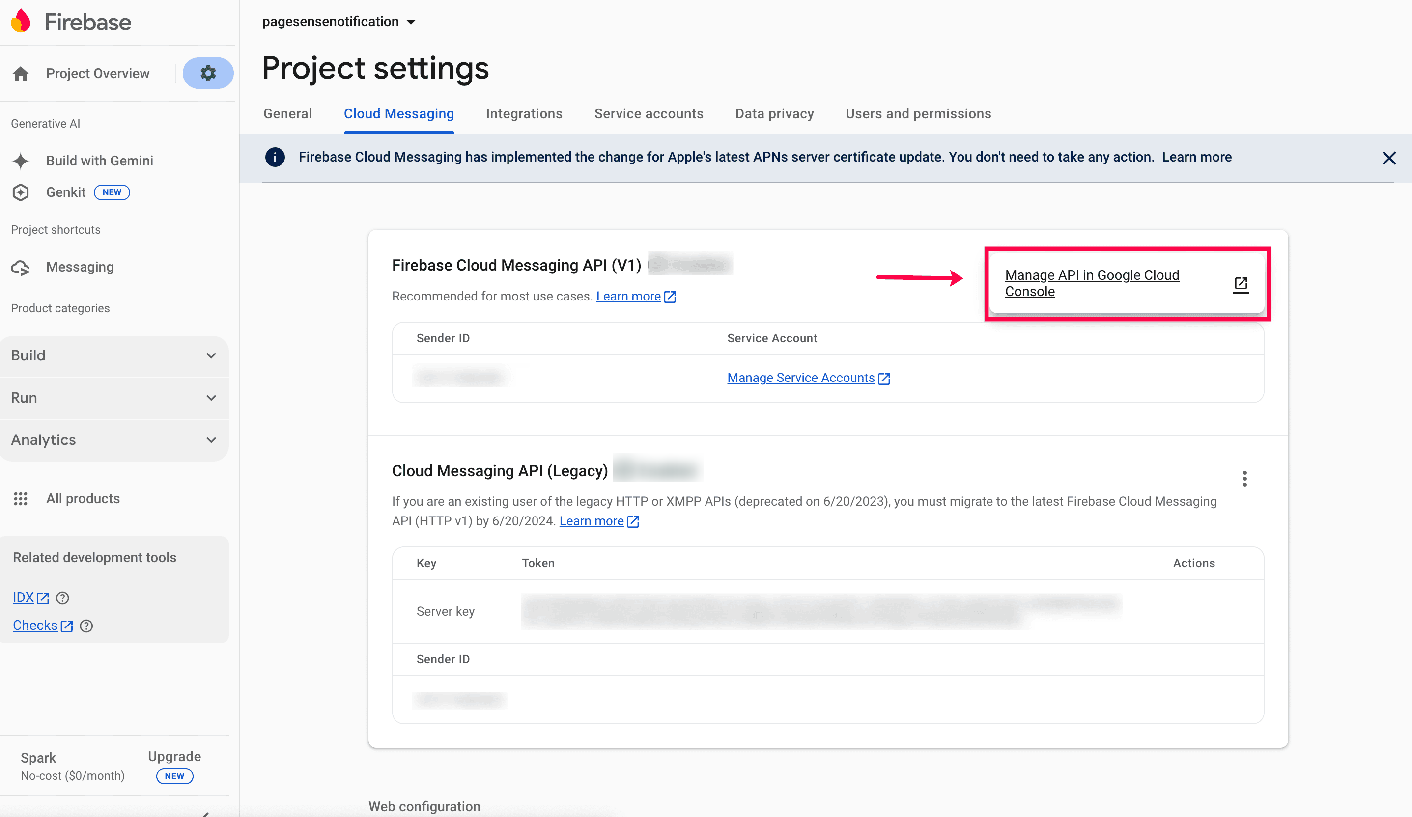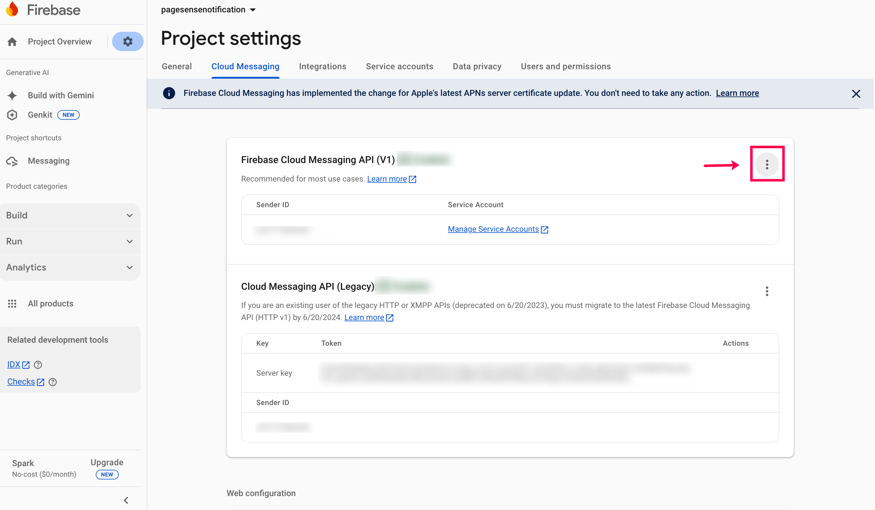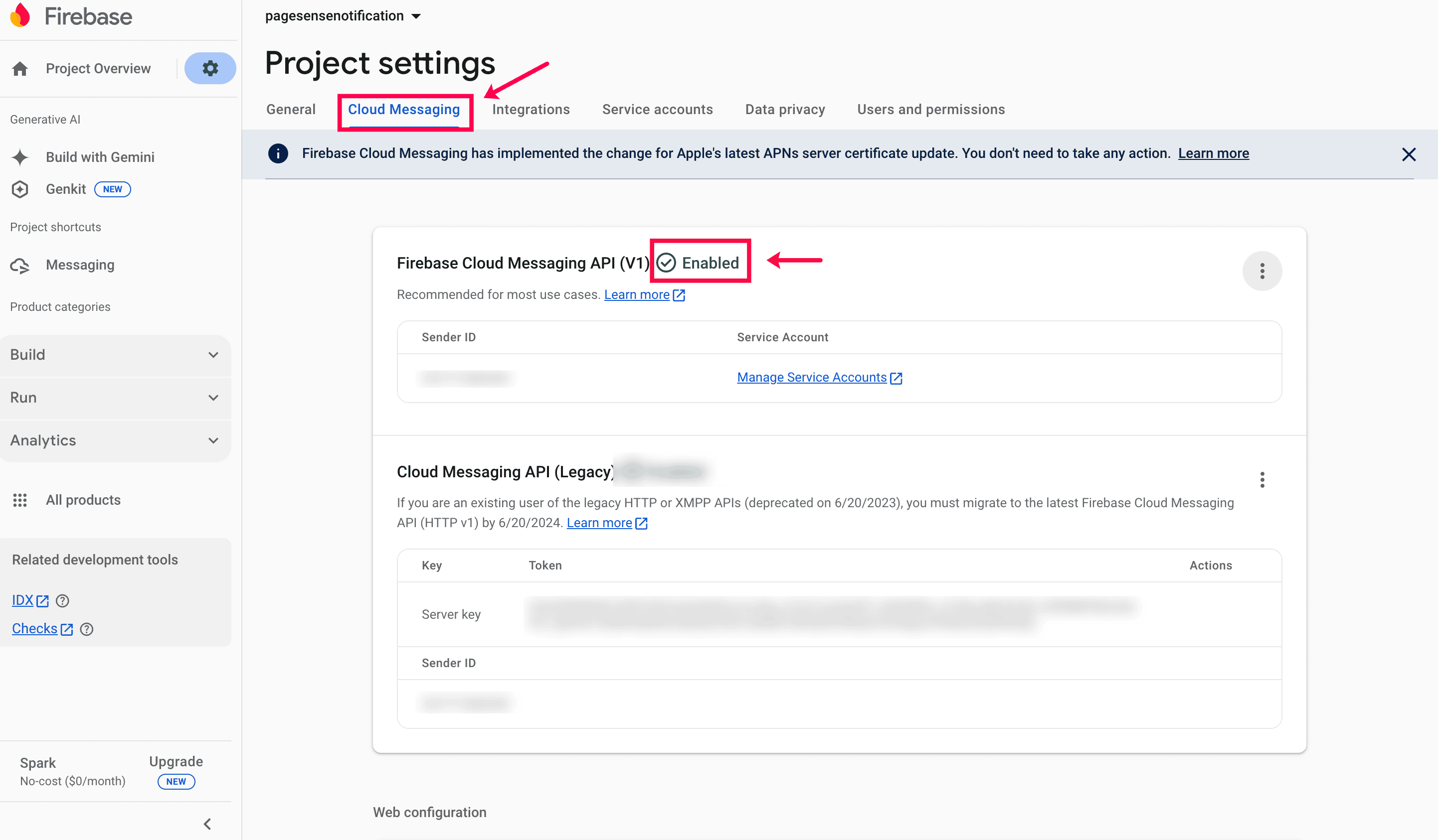 9. Ensure the Firebase Cloud Messaging (FCM) API (V1) is enabled under the Cloud Messaging of the FCM console.