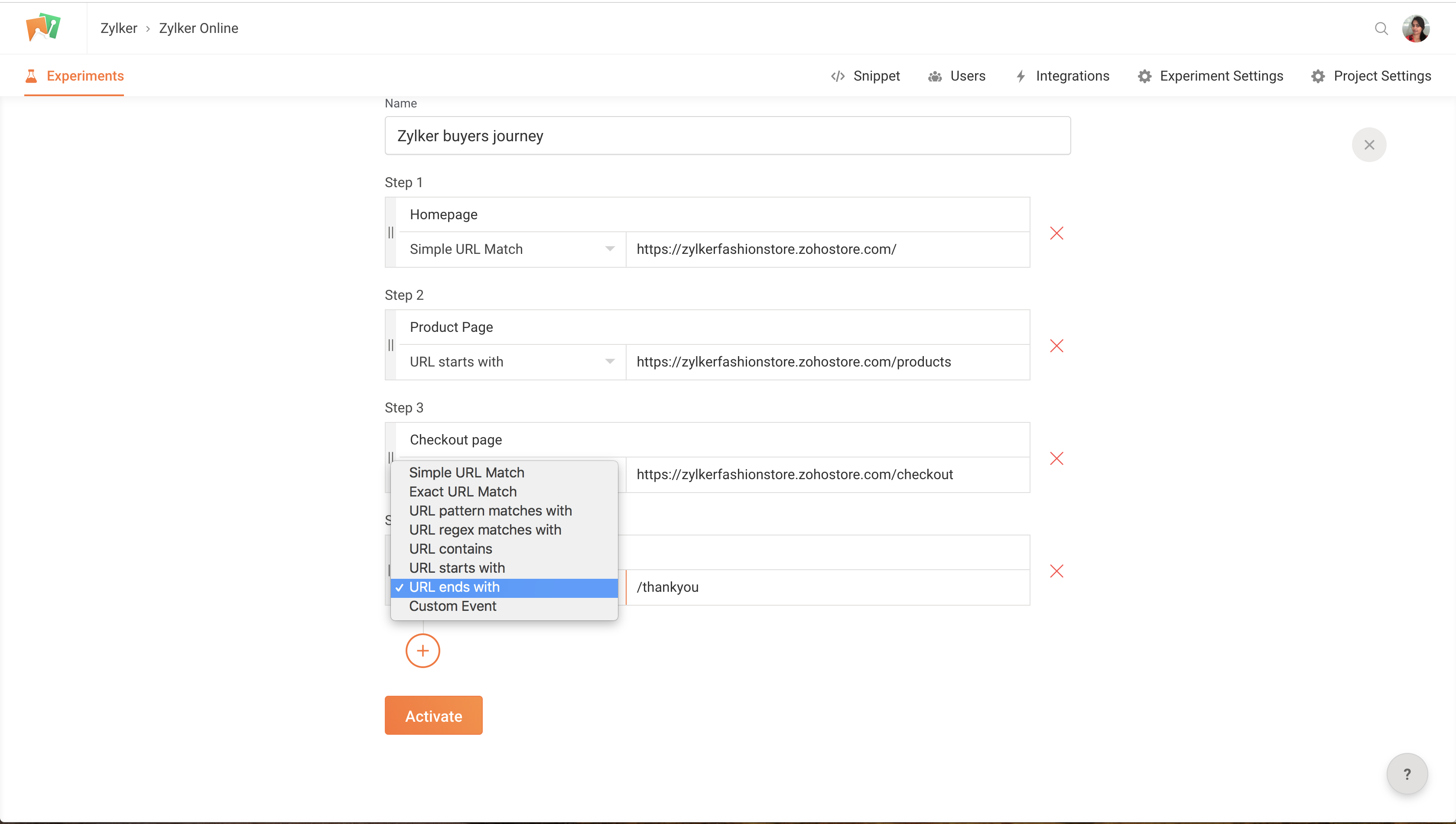 Ensure that theZoho PageSense code snippet is installed to all the URLs of your funnel experiment.