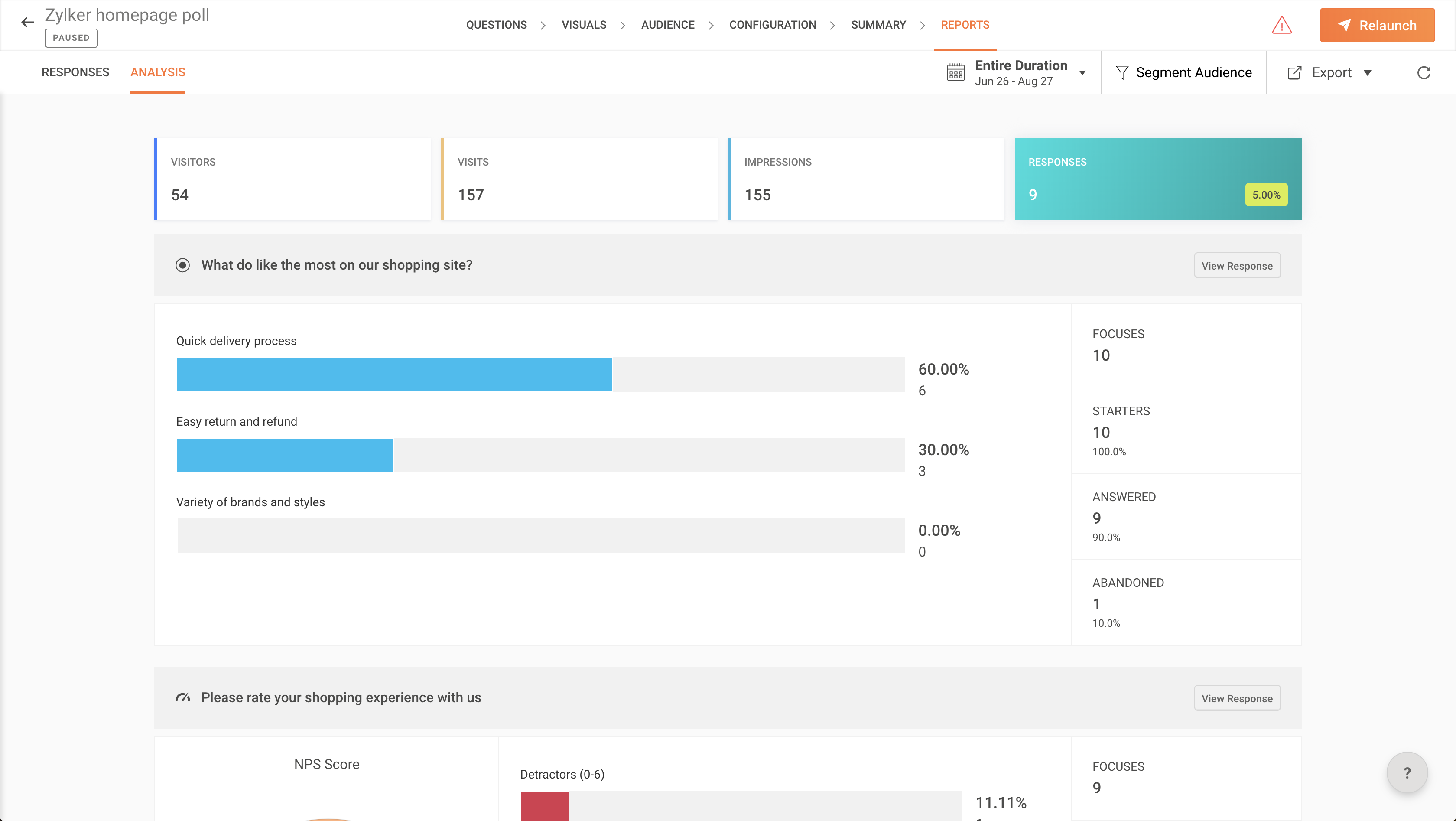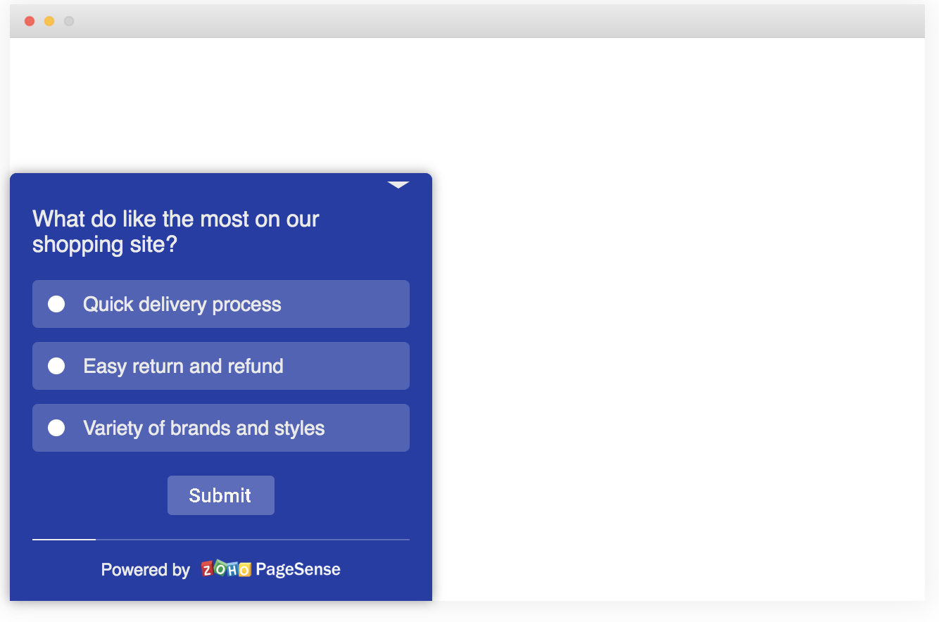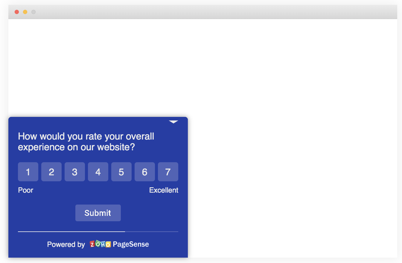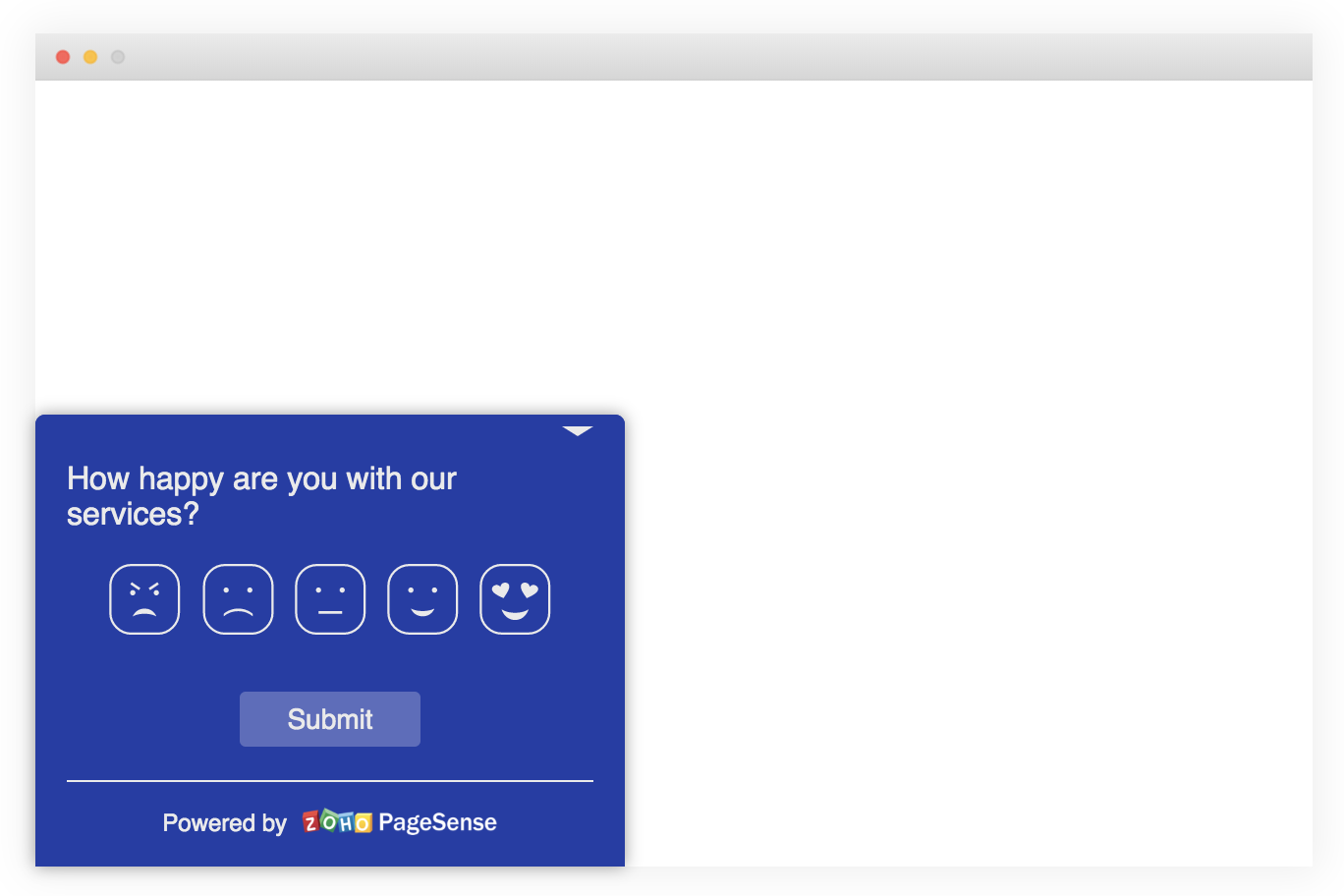 PageSense lets you place an online poll directly on your website or blog pages to gauge your customers' opinions on specific topics, products, or services offered by your business. It does this right from within a small window on your screen. Once you run the poll, the responses collected for different poll types—long answers, NPS ratings, star ratings, smiley ratings, and others—will appear under the Reports tab of your experiment. These direct answers provided by your customers can help you analyze the performance of your site and further tell you how they feel about your website, such as:
