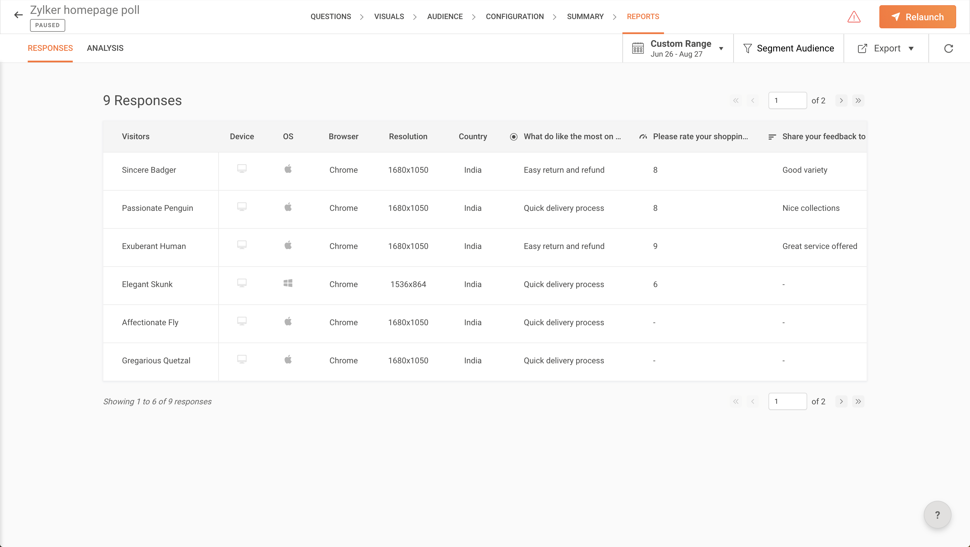 Furthermore, the poll report also gives you detailed information on individual visitors such as their country, device/browser used, the feedback shared, and their rating, which we'll explain in the topics below.