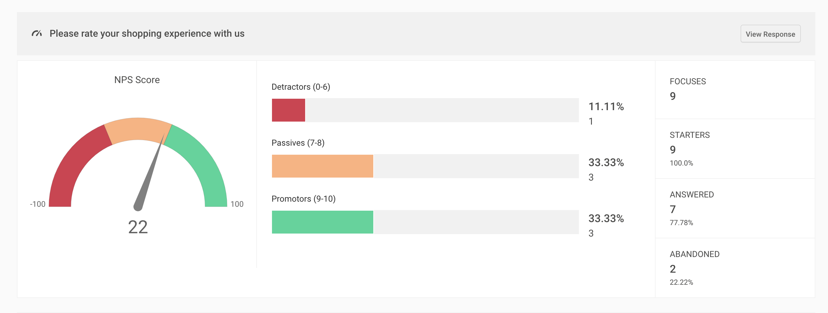 This chart represents the NPS rating given by the user ranging from -100 to +100 along with the individual percentage of promoters, detractors, and passives, which are classified into three categories: