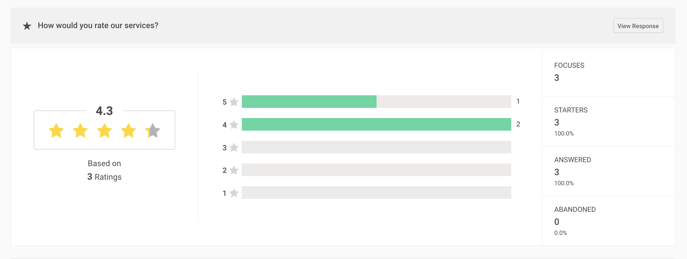 The responses to a star rating question are presented in two sections in your reports: one that displays the average ratings received from users on a graphical star scale and another with the breakdown of individual star ratings on horizontal sliders as shown in the figure below. To calculate the average star ratings, divide the sum of all star ratings obtained by the total responses obtained in your ratings scale.