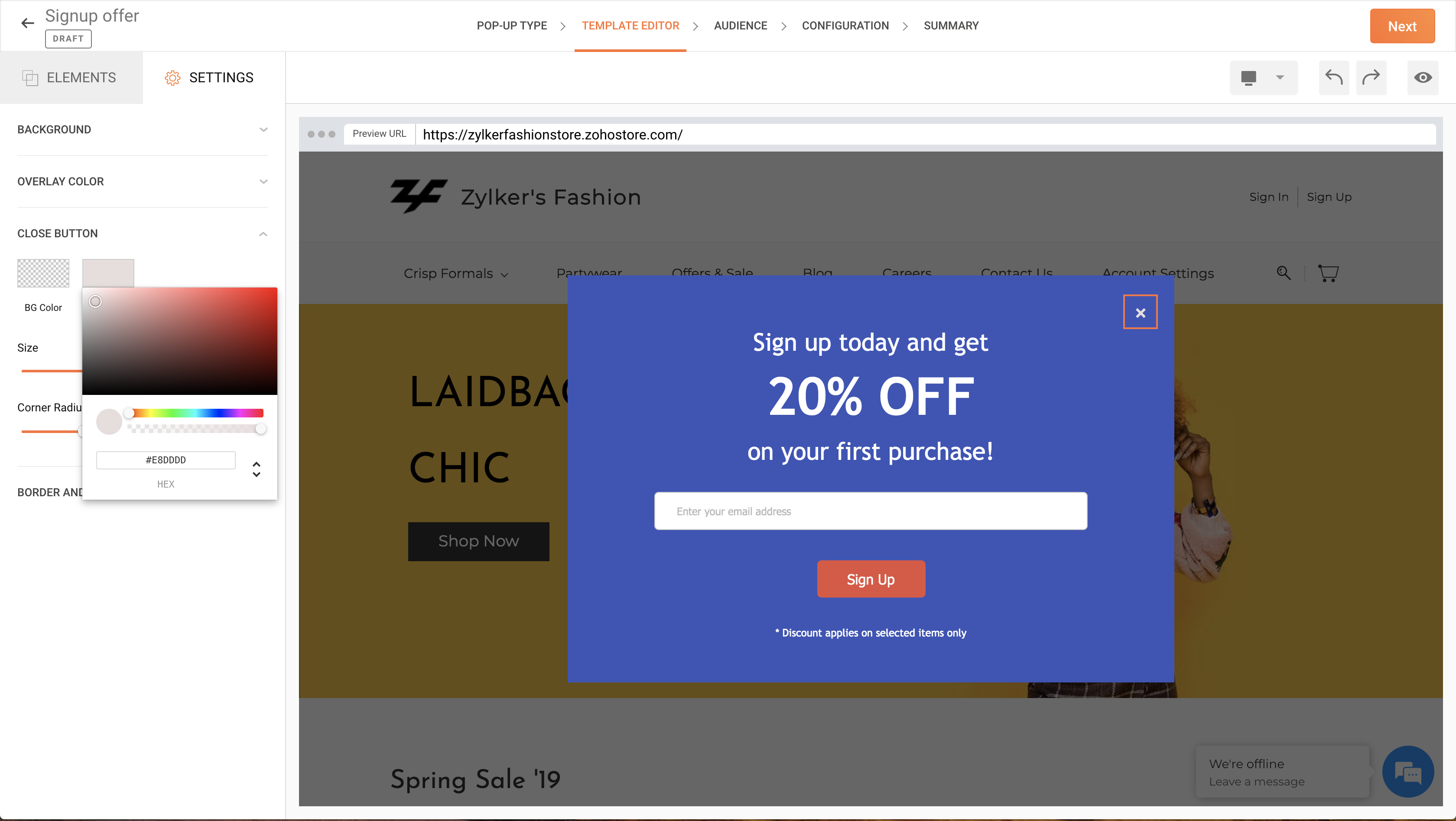 Important: Ensure that the Zoho PageSense code snippet is installed on all the URLs you want to show the pop-up on.