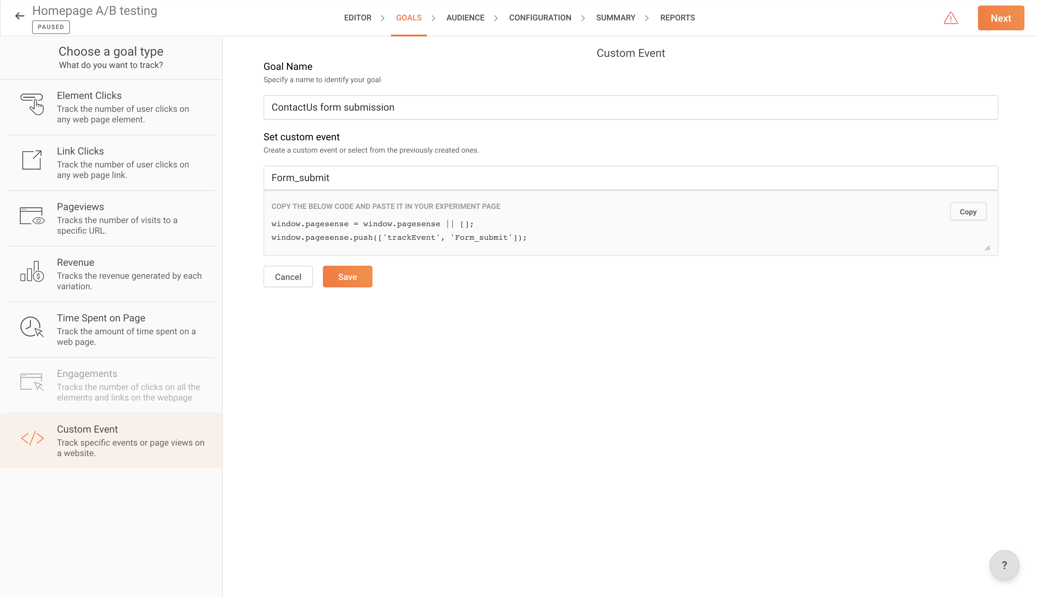 To create a custom event goal: