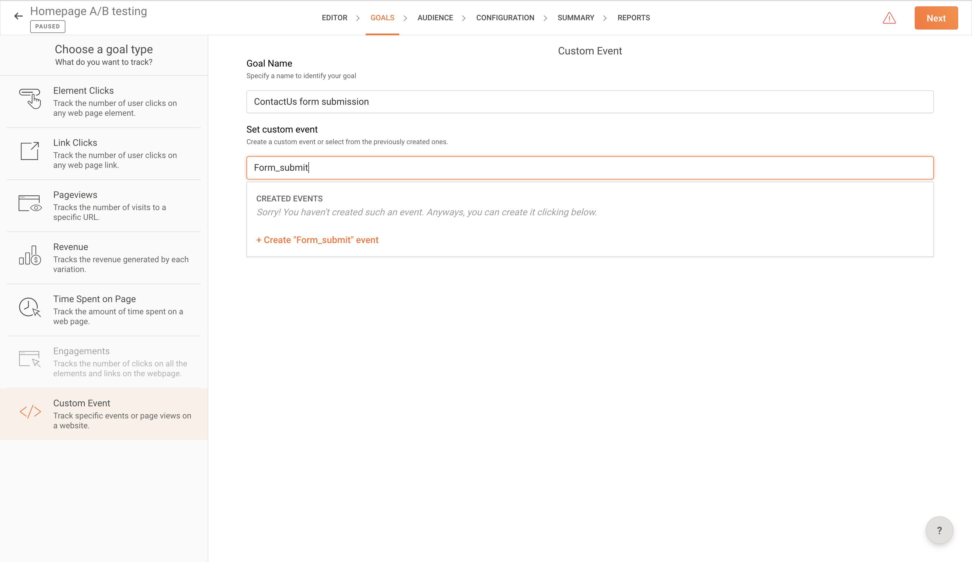 2. Choose Custom Event from the left pane, then enter a descriptive name for the goal in the text box.