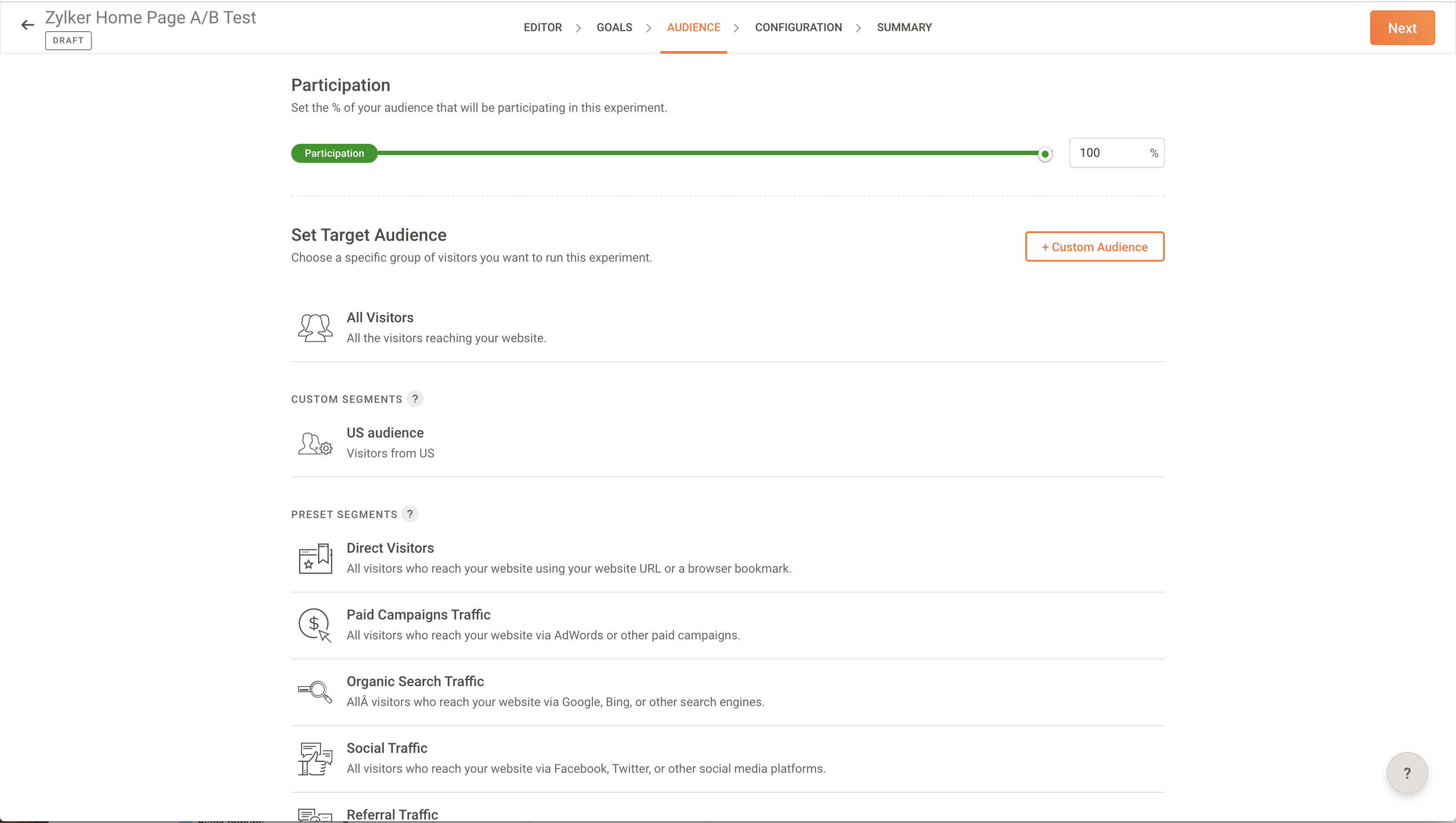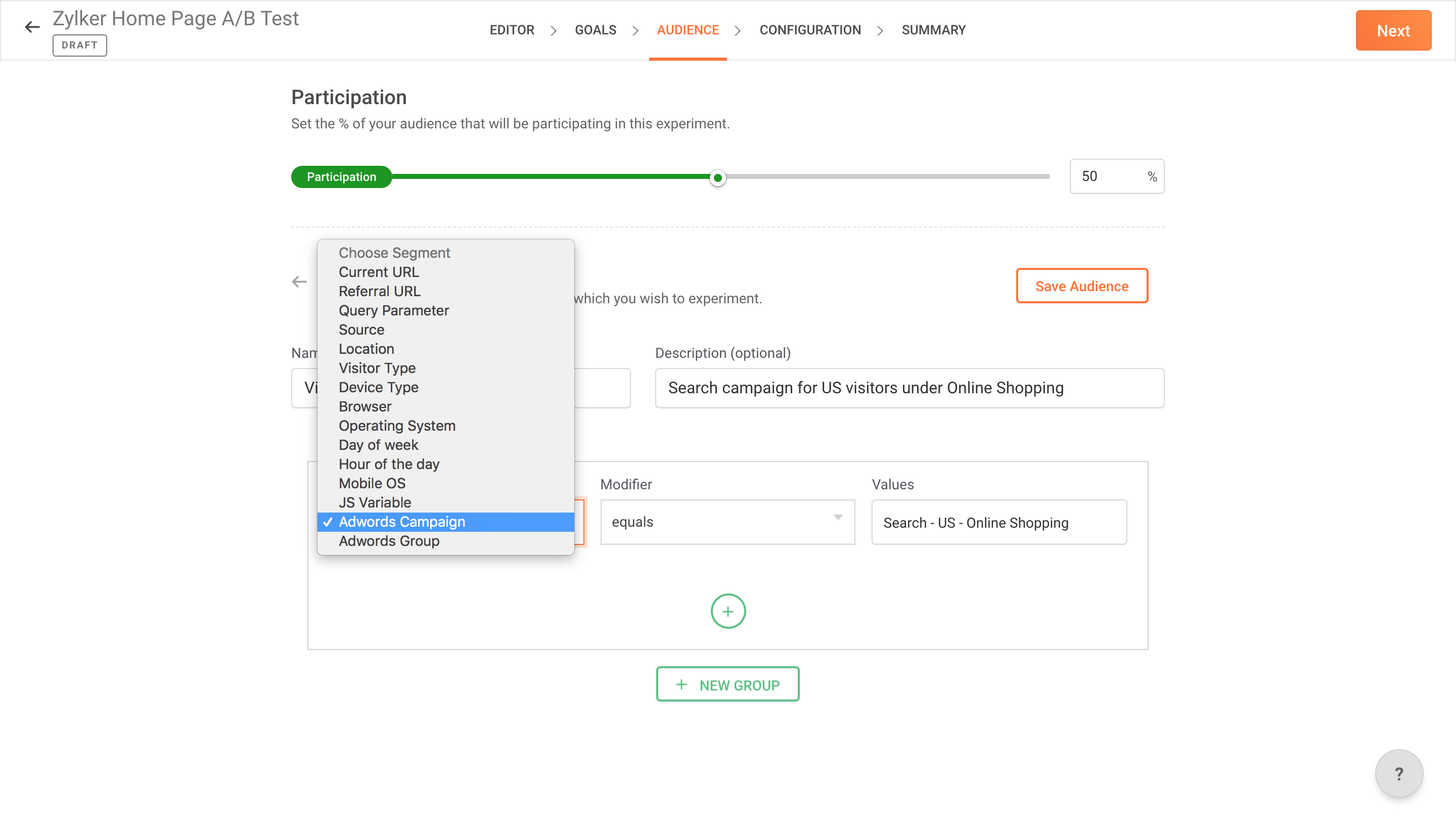 5. Finally, click Save Audience and then Next to proceed to the next steps.