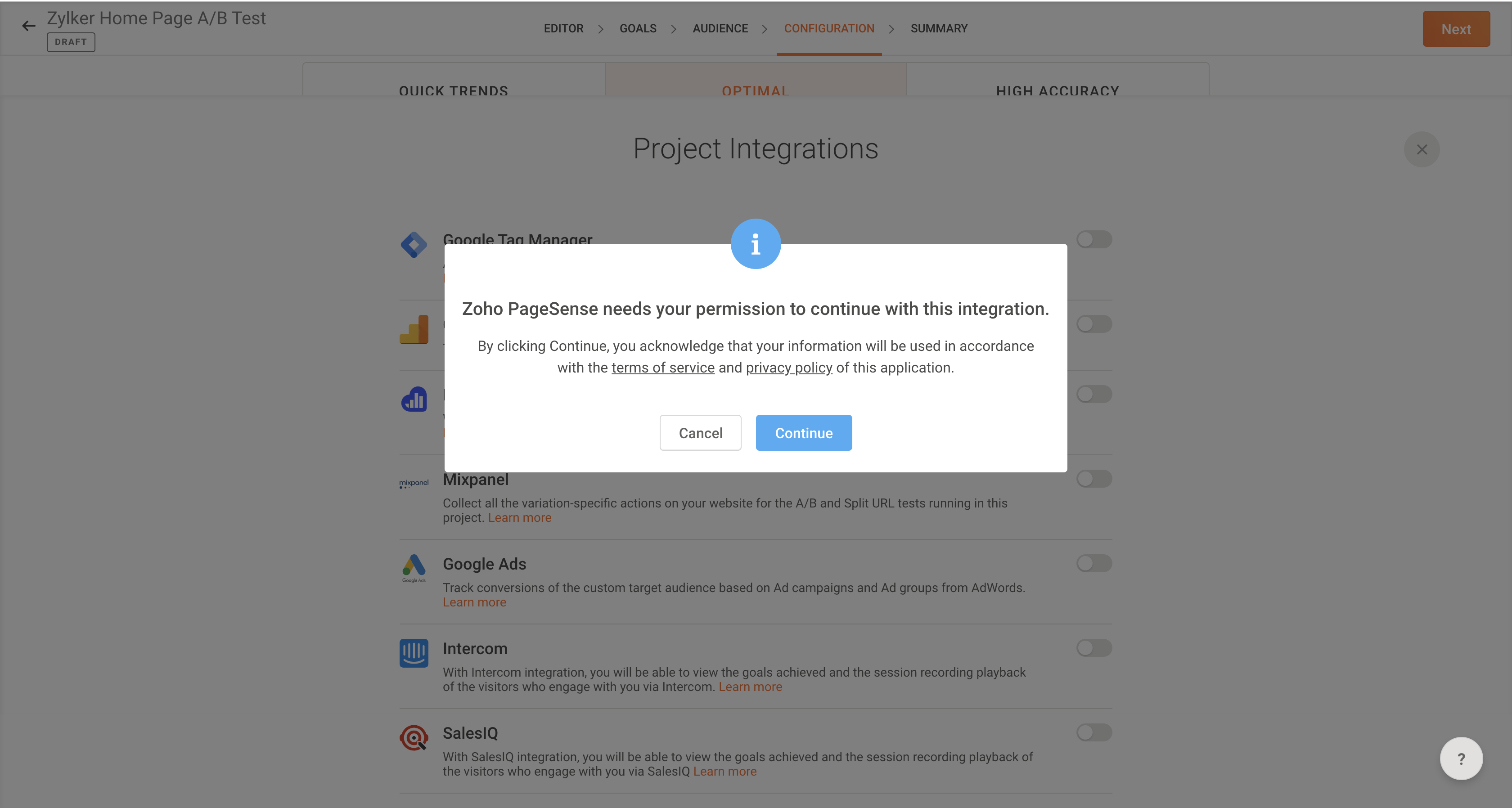 2. Navigate to the Add Integrations section at the bottom of the page and enable the Google Ads integration. Learn more about integrating Zoho PageSense with Google Ads.