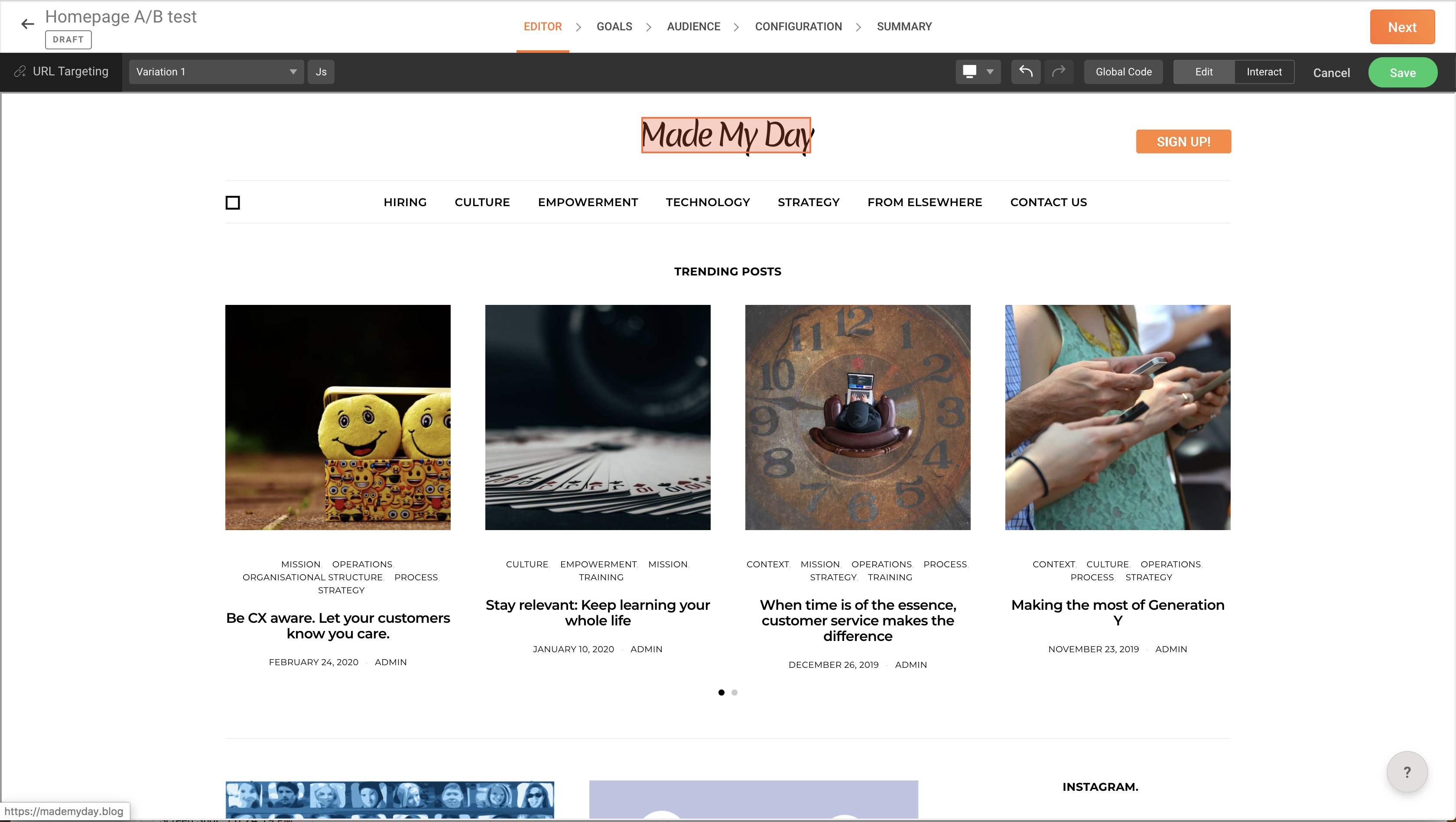1. Select your A/B experiment and click the EDITOR tab at the top.