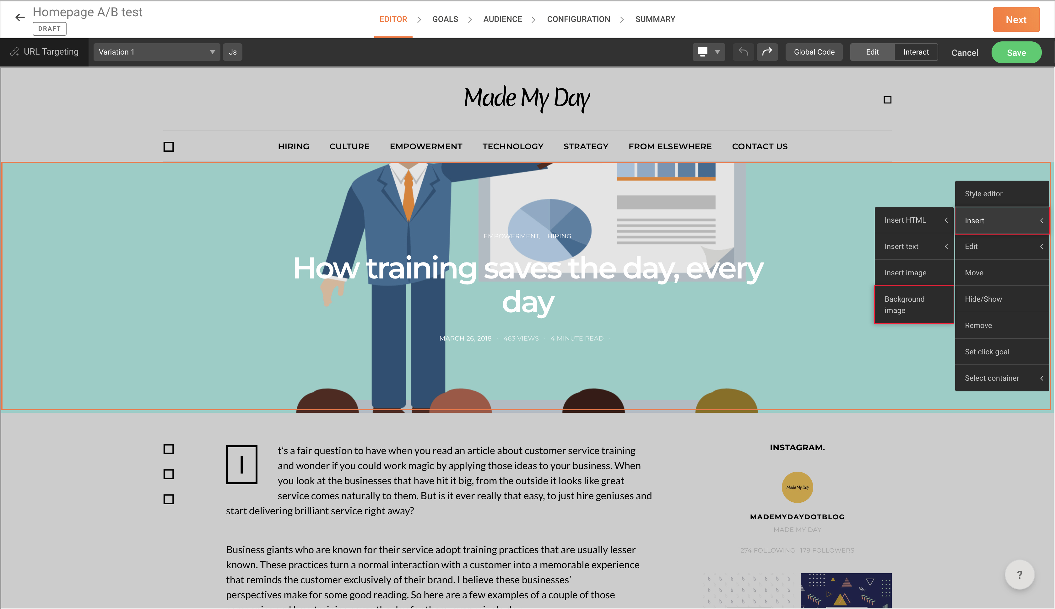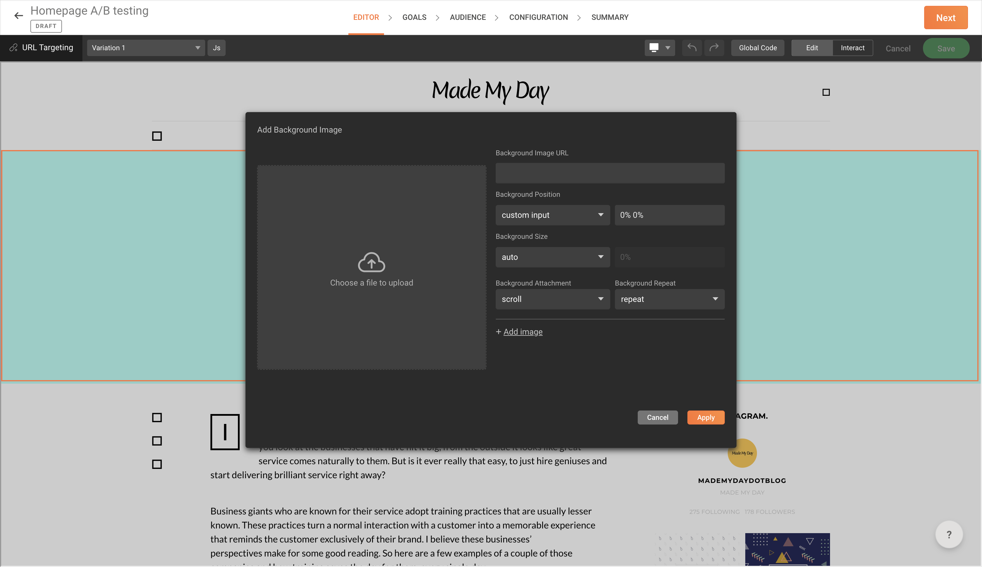 Having a relevant background image for your business site can help showcase your products and services in a visually appealing way and allow users to develop an instant connection with your brand. This could include displaying a relevant cover photograph on your blog page to illustrate the story in your post or adding a product banner image to your webinar registration page to reinforce your brand to new users. You can add all these background images using the PageSense visual editor to upload large background images to your variation pages and make edits to the background color, font style, and picture border to instantly capture your visitors' interest.