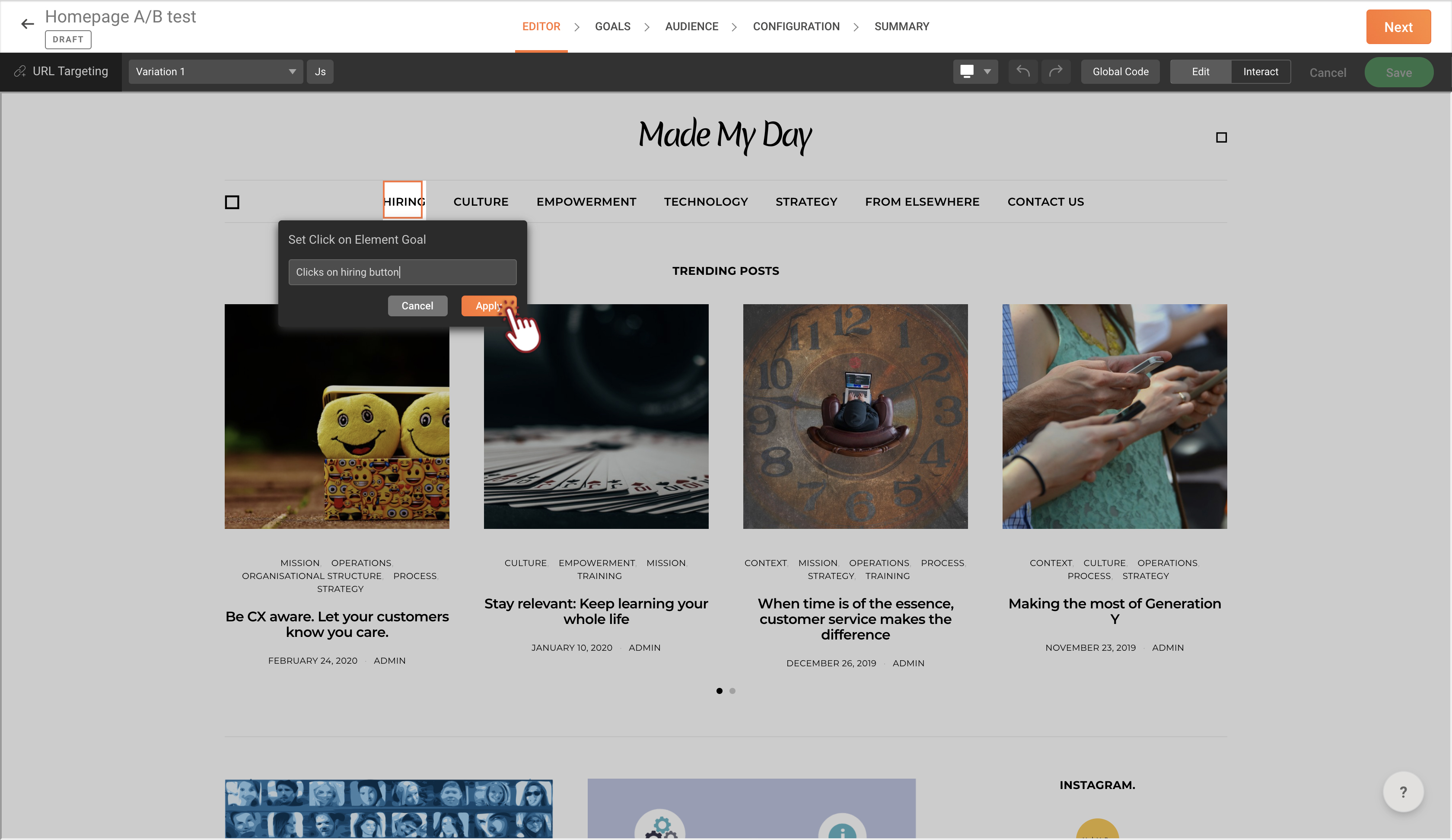 PageSense allows you to choose a specific element to the variation page and add a click-on-element goal to it in the visual editor. This method of setting element goals helps you track clicks on buttons such as signup, submit, or any CTA on your website page and collect visitor metrics as you make changes for testing. You can also add other types of goal to your variation from the Goals tab of the experiment.